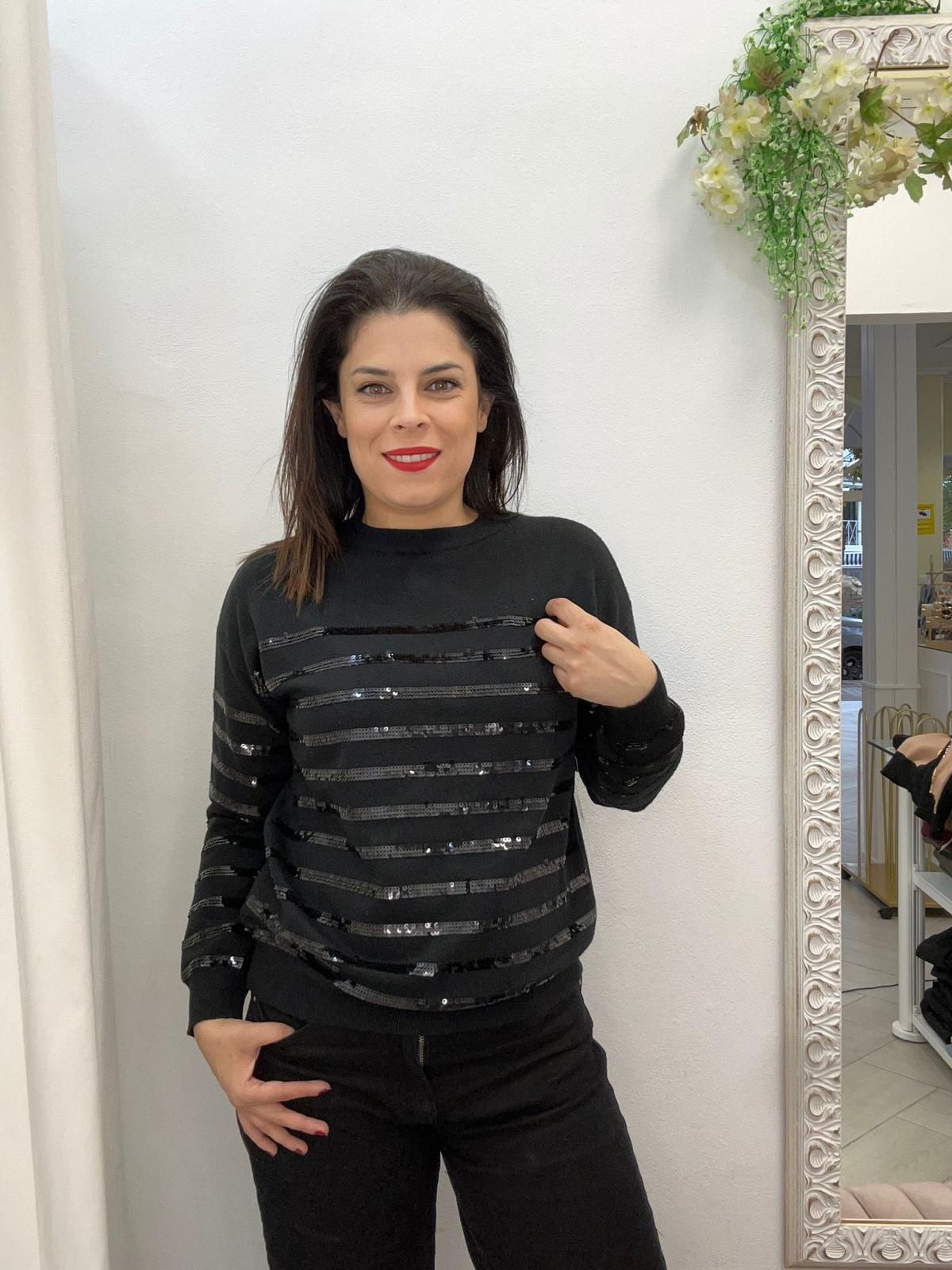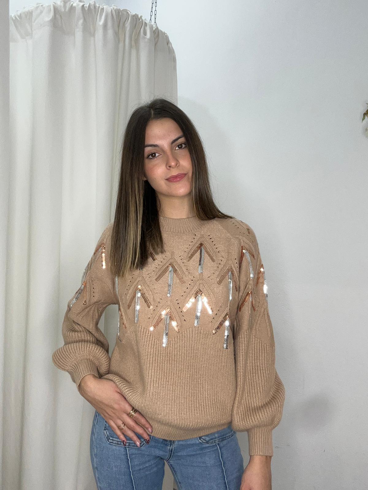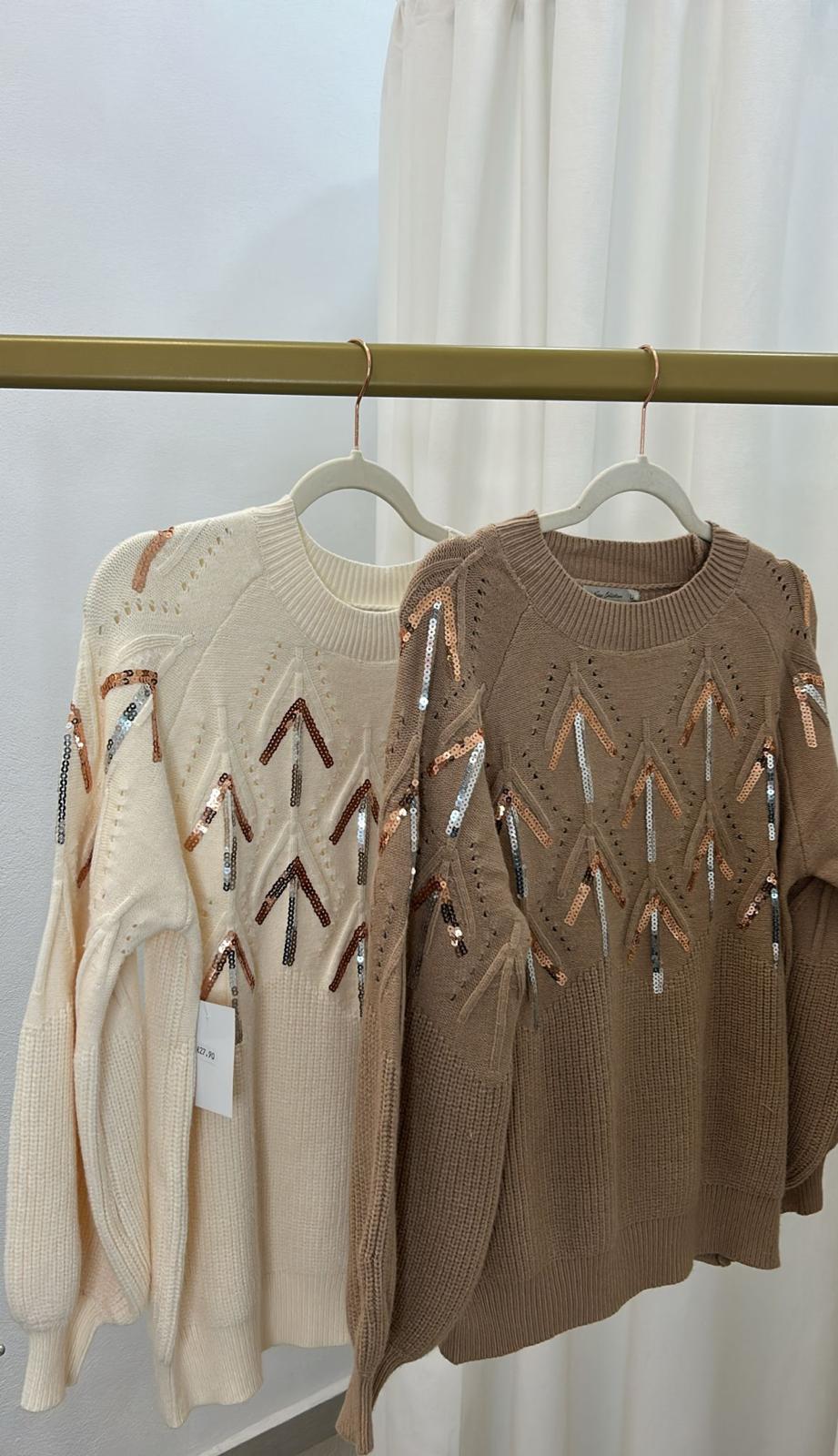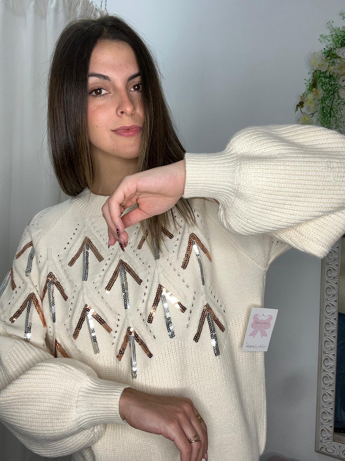 Este jersey de punto destaca por su original diseño de flechas bordadas con lentejuelas brillantes en tonos dorados y plateados. Su tejido suave y cálido lo convierte en la prenda ideal para los días de frío, mientras que los detalles decorativos aportan un toque de luz y sofisticación.