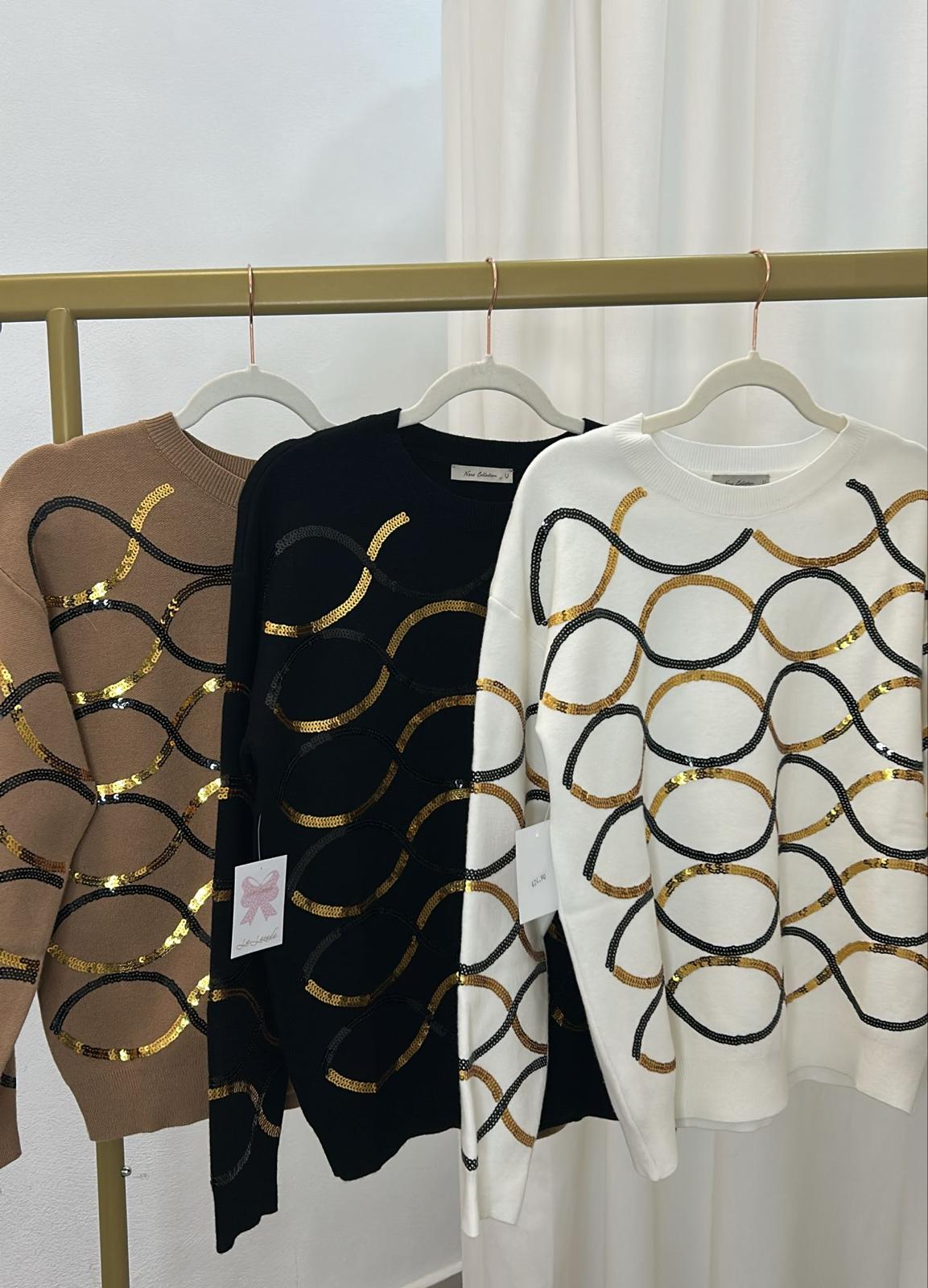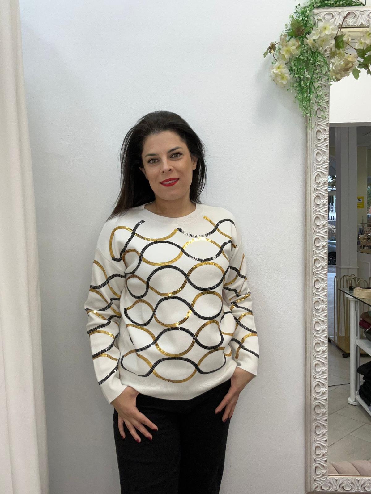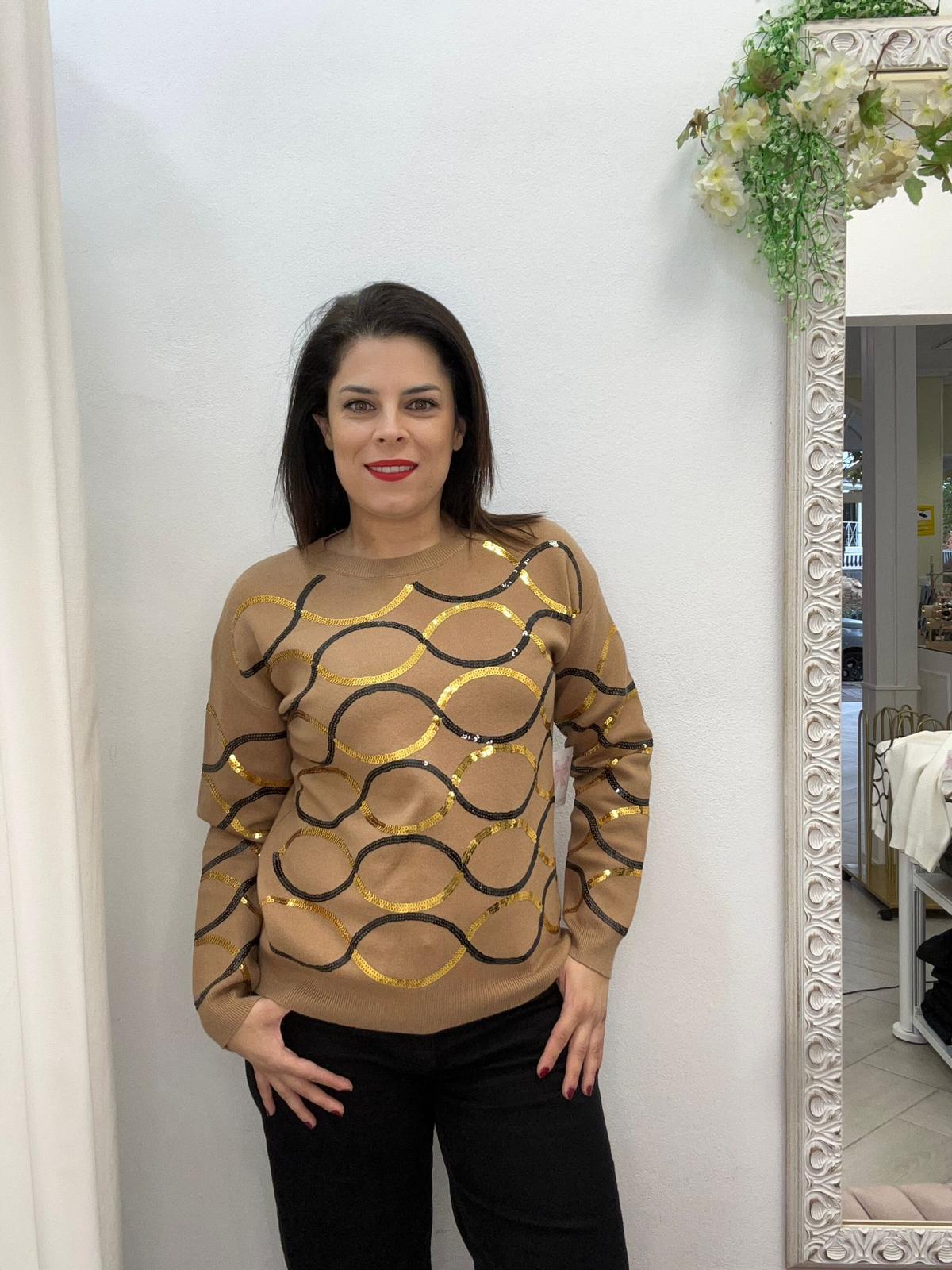 Este jersey con diseño de ondas y detalles en brillo combina la suavidad del punto con un diseño moderno y luminoso. Presenta un original estampado de ondas decoradas con lentejuelas doradas y negras que aportan un toque sofisticado y festivo, perfecto para destacar en cualquier ocasión.