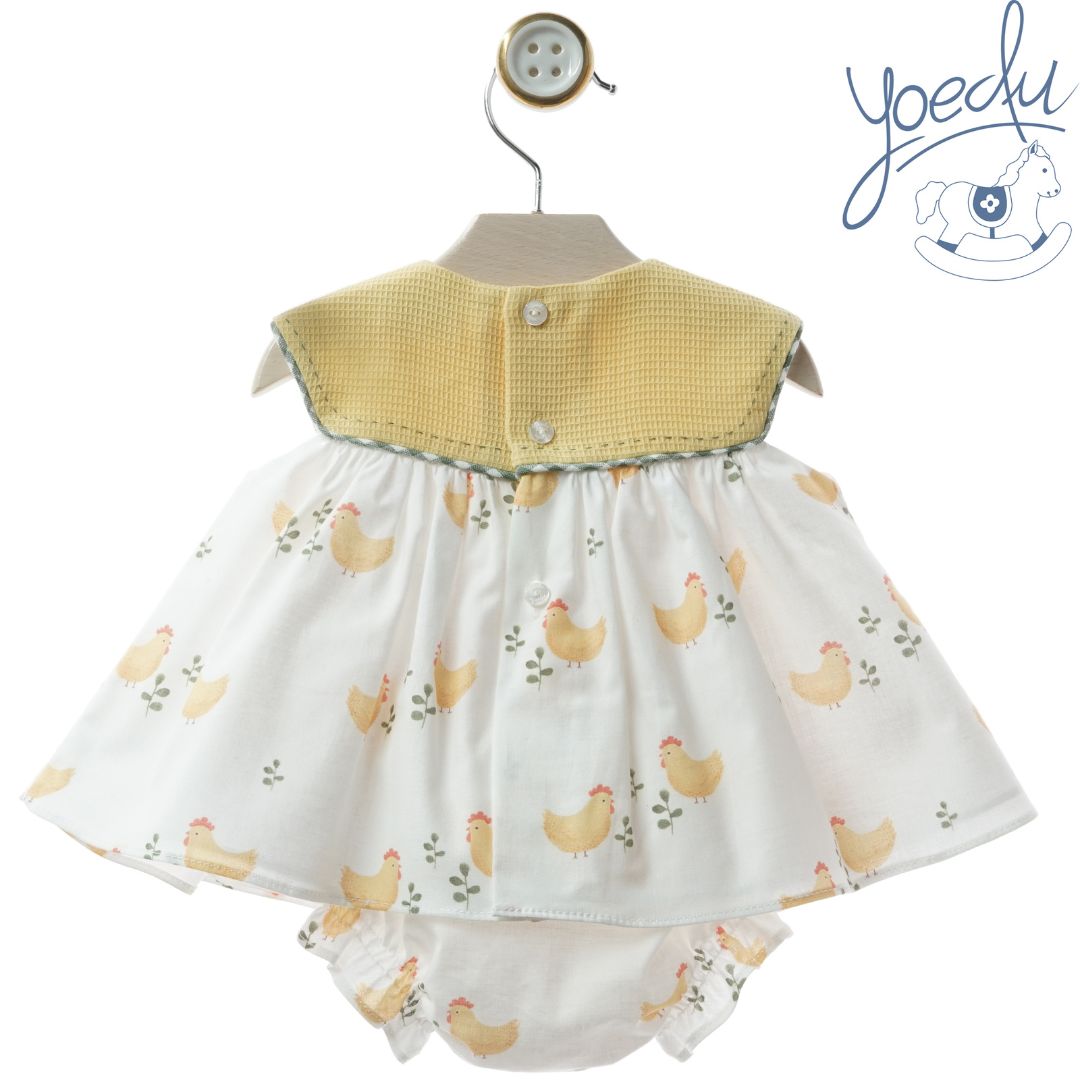 El jesusito presenta un precioso estampado infantil sobre fondo claro, con canesú en tono mostaza que aporta un contraste cálido y original. Su corte amplio y sin mangas garantiza frescura y libertad de movimiento, ideal para los días de primavera y verano. Se completa con un pololo a juego, confeccionado en tejido suave y ligero, con cintura y perneras elásticas para un ajuste cómodo.