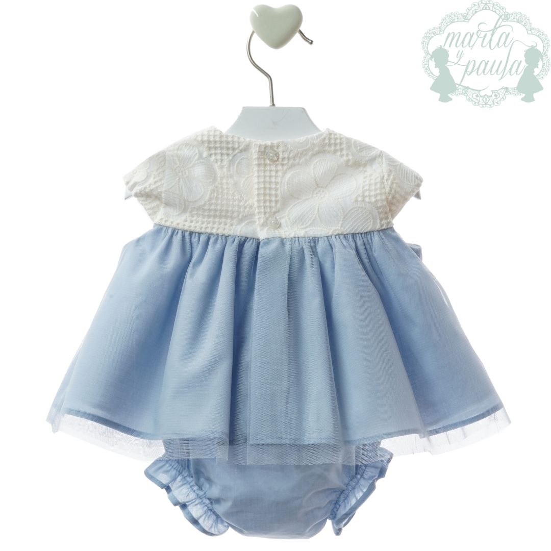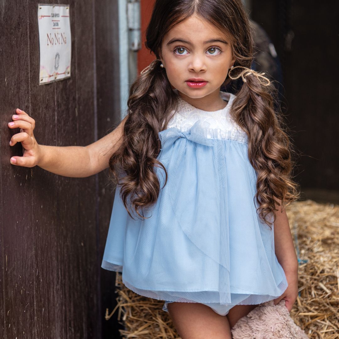 Diseño Bi-materia: Combina un cuerpo superior en encaje calado blanco de alta calidad con una falda de tul suave en azul celeste que aporta un vuelo espectacular.