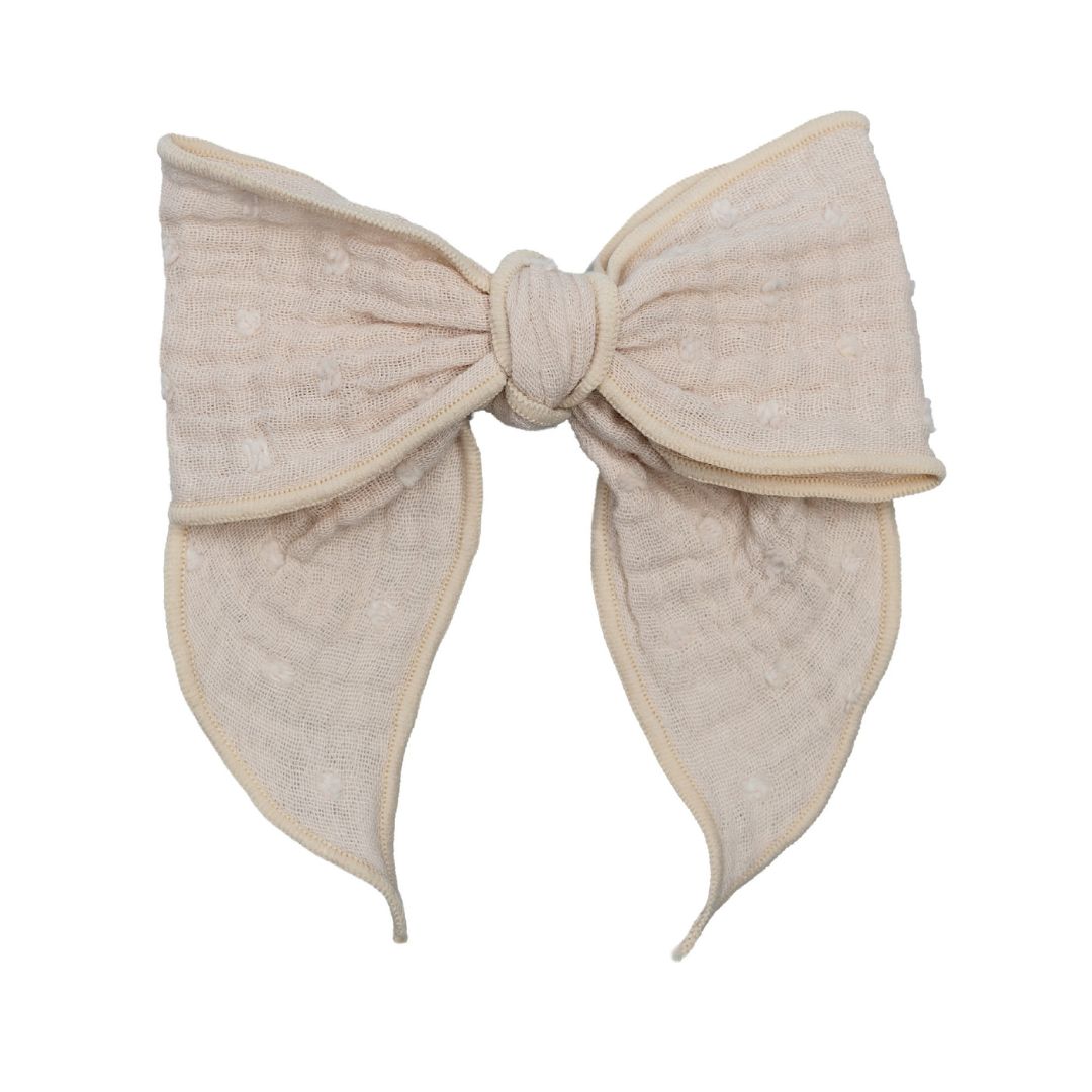 El Lazo con pinza modelo Atari de Calamaro es el accesorio definitivo para dar un toque de sofisticación y dulzura a los peinados de las más pequeñas. Confeccionado en un tejido ligero con una textura delicada, este lazo blanco es un básico imprescindible que combina con todo, desde conjuntos de diario hasta vestidos de ceremonia.