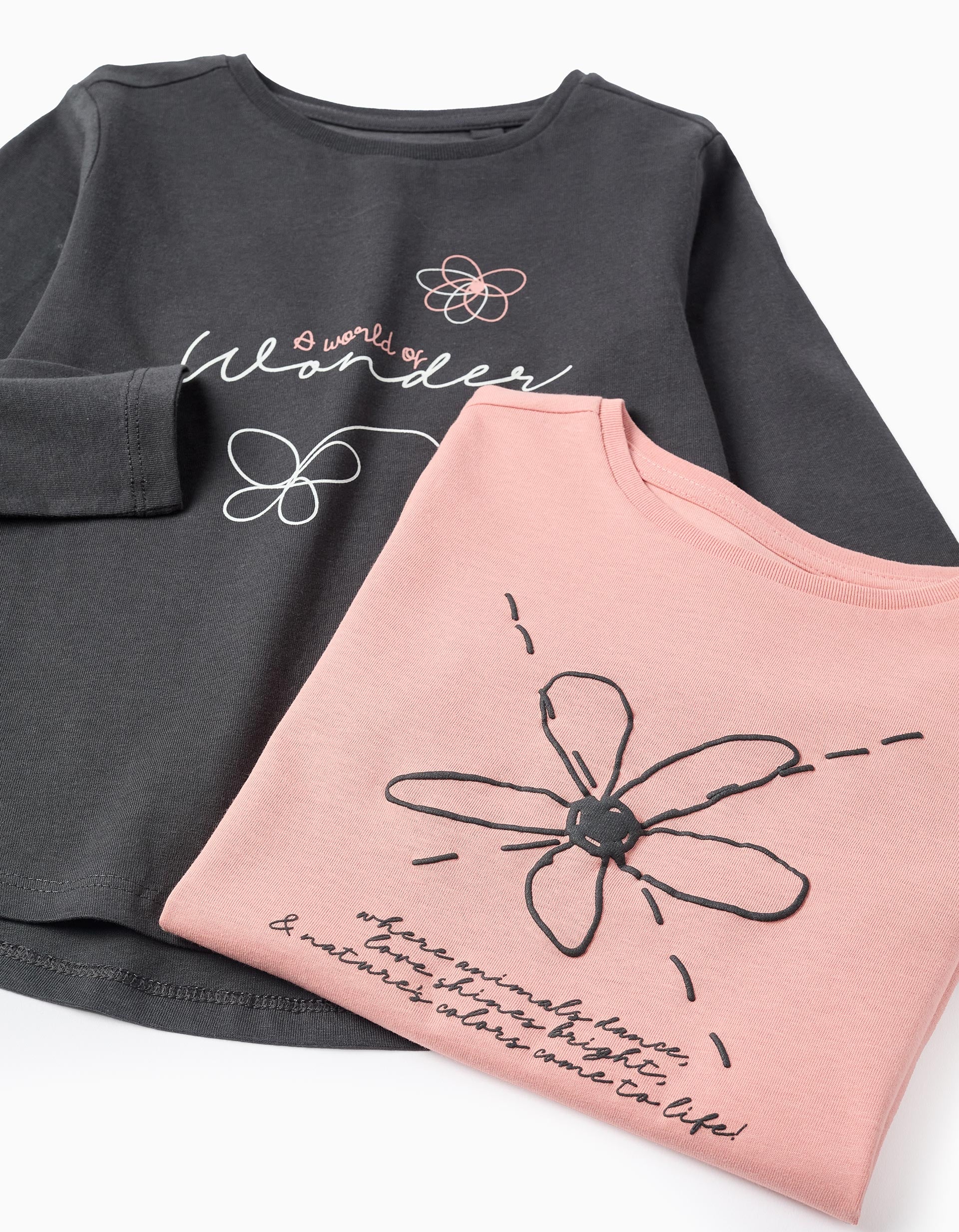 Pack de dos camisetas de manga larga, una rosa y otra gris. 100% algodón. Estampado delantero con detalles en relieve. Base asimétrica, ligeramente más larga por detrás. Etiquetas interiores impresas para no irritar la piel. ¡Un estampado divertido para los looks de diario! We Care: artículo certificado Oeko-Tex Standard 100, que garantiza la ausencia de sustancias nocivas o irritantes para la piel.