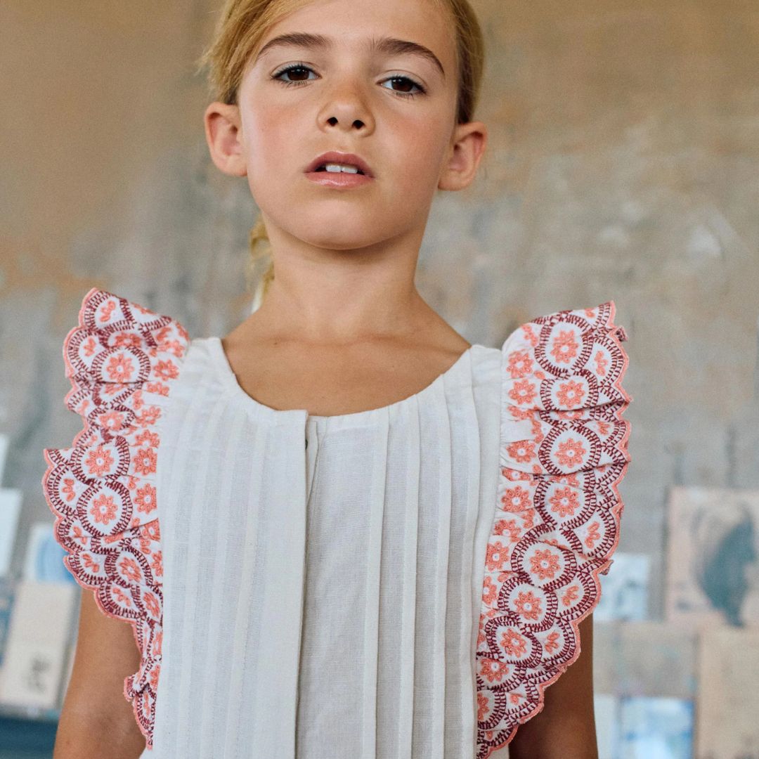 Volantes Bordados: Destaca por sus espectaculares volantes en los hombros, decorados con bordado inglés en tonos rosados y mandarina que aportan textura y un toque de color vibrante.