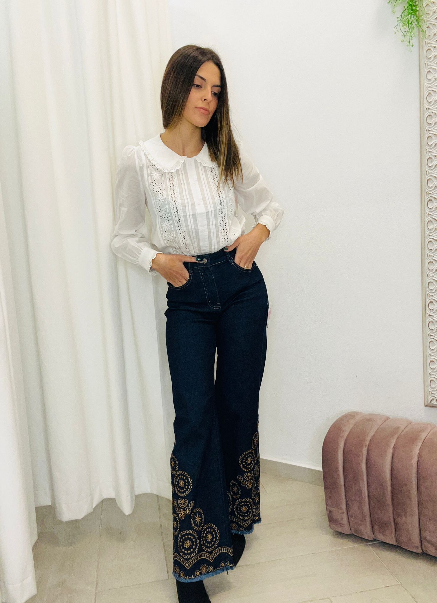 Presenta un diseño muy especial gracias a los bordados decorativos situados en el bajo de ambas piernas.