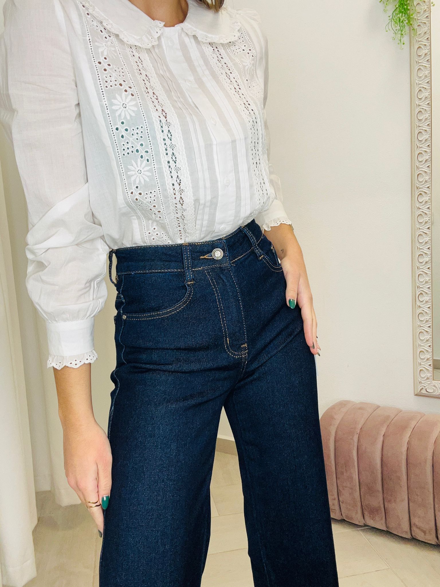Vaquero de tiro alto con pernera ancha, confeccionado en denim oscuro.