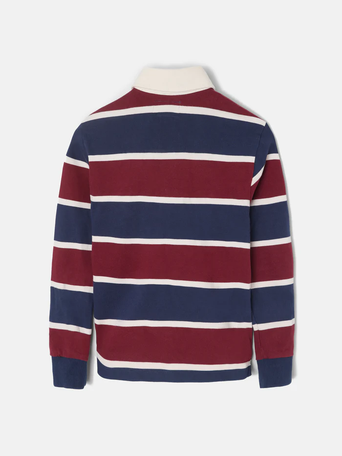 Este polo infantil de estilo rugby clásico destaca por su diseño atemporal con rayas en burdeos, azul marino y blanco, perfecto para looks casuales con un toque deportivo.
