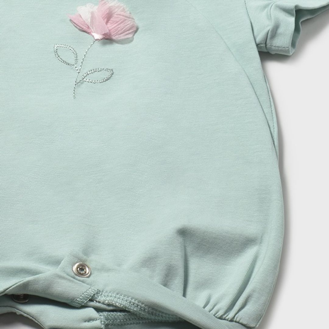 Dos Diseños Exclusivos: El set incluye un pelele en blanco puro con delicado nido de abeja y bordados florales, y otro en un refrescante tono verde aqua con una flor central bordada.