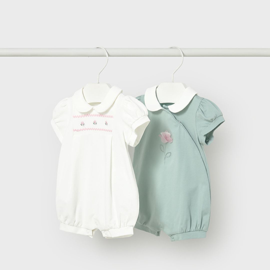 Este encantador set de dos peleles de Mayoral es la combinación perfecta de dulzura y comodidad para los días más cálidos. Confeccionados en algodón suave, estos peleles cortos están diseñados para ofrecer libertad de movimiento mientras mantienen un estilo clásico y cuidado.