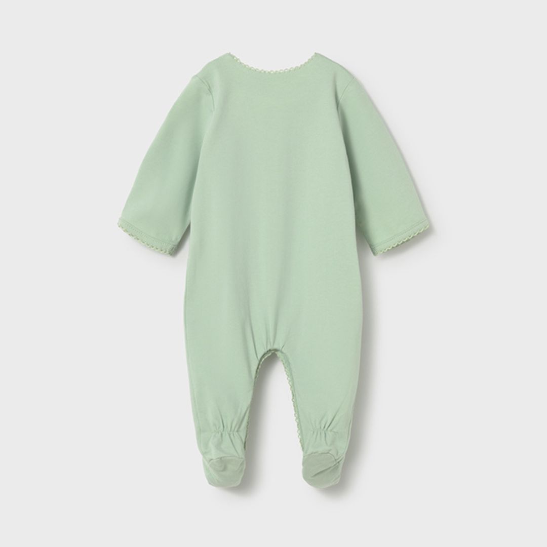 Dos Diseños Coordinados: El set incluye un pelele en color verde alga liso con bolsillos frontales adornados con puntilla calada, y otro con un fresco estampado floral sobre fondo verde claro.