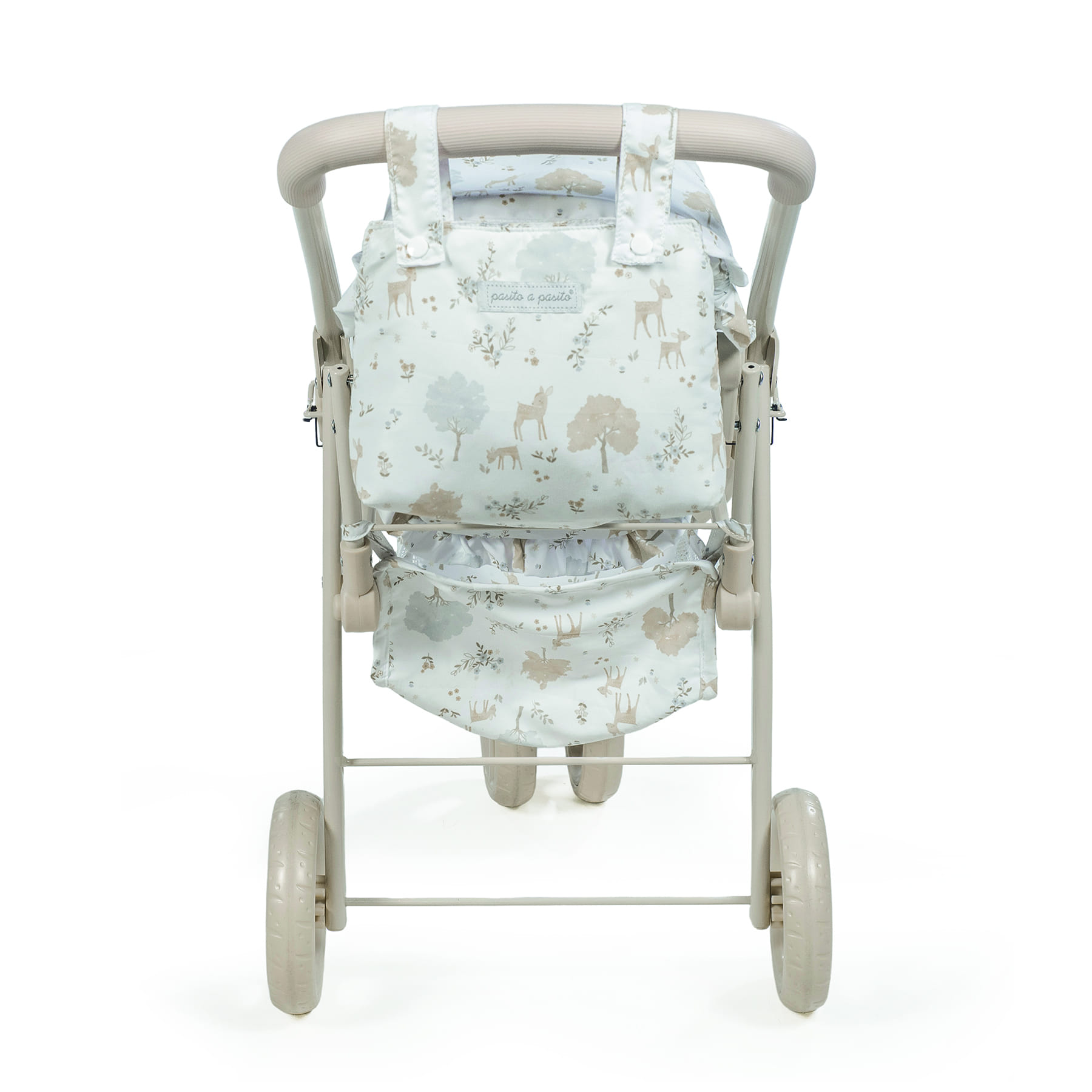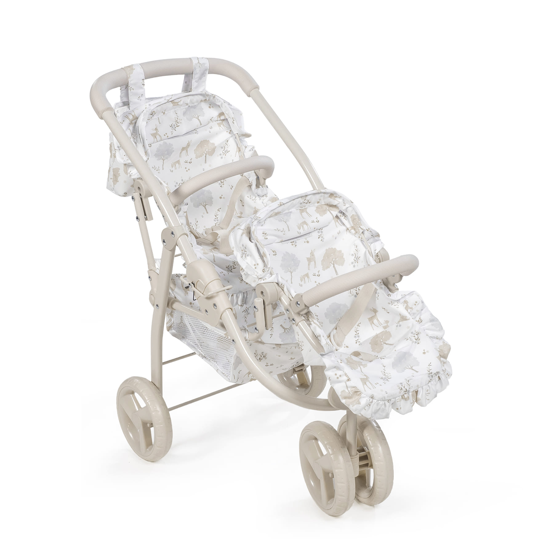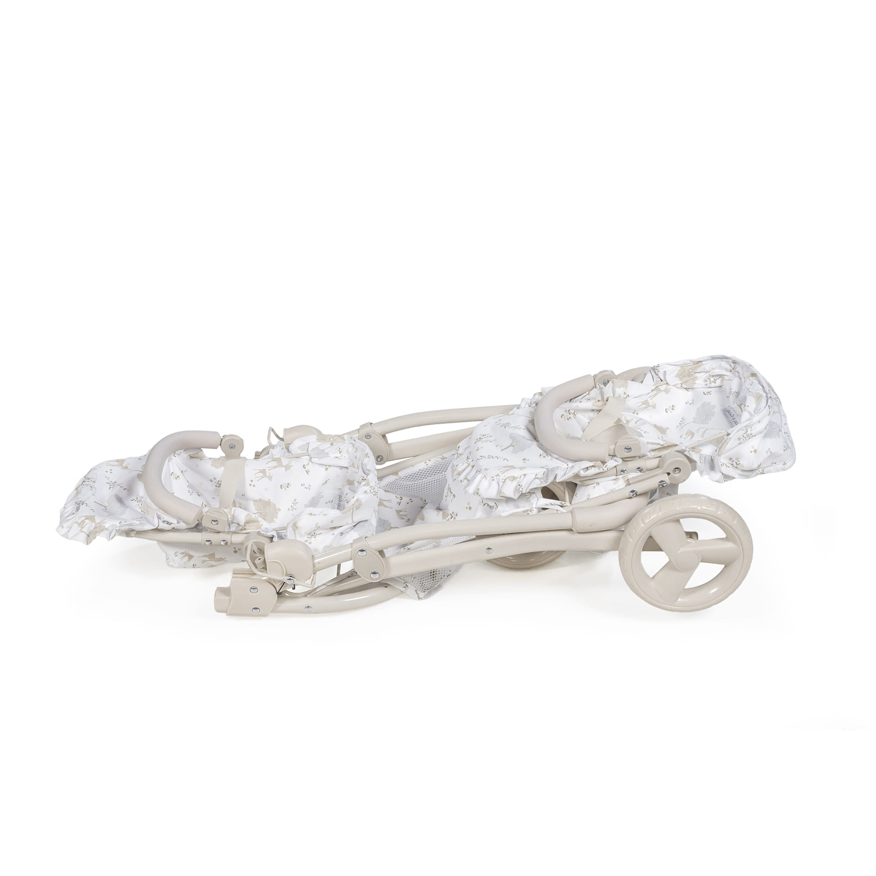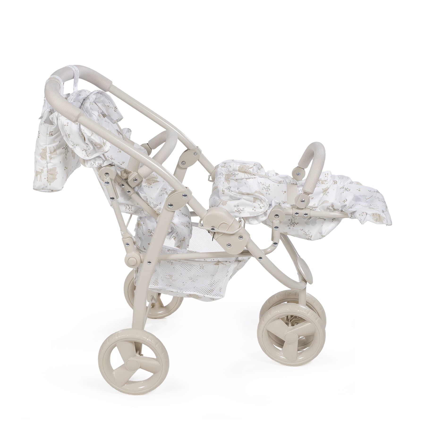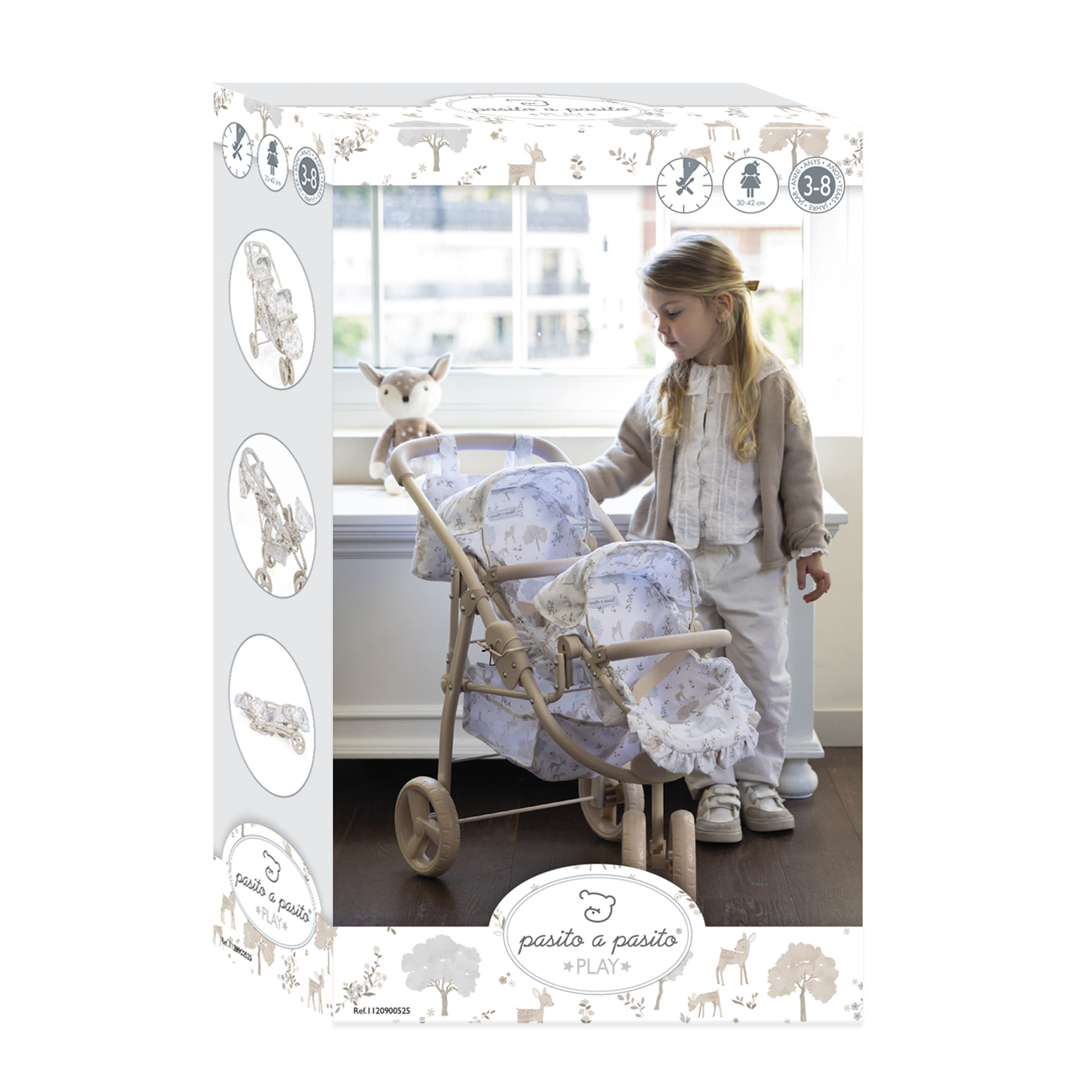Cuenta con dos asientos en línea, cada uno con su propia capota y barra de seguridad, lo que permite llevar dos muñecos a la vez de forma práctica y realista. Su estructura ligera, el manillar ergonómico y las ruedas resistentes facilitan un manejo suave tanto en interiores como en exteriores. Además, incorpora una cesta inferior de almacenamiento, ideal para transportar accesorios y juguetes.