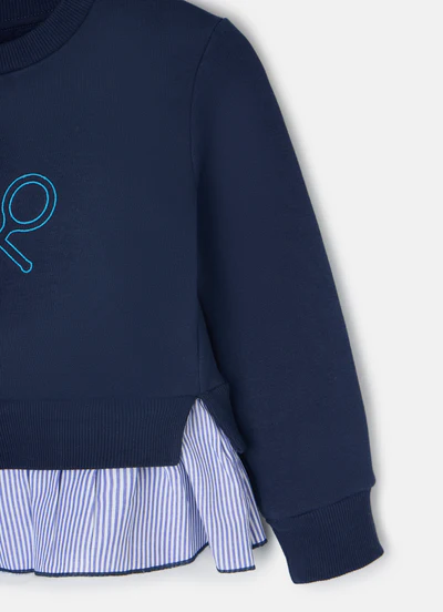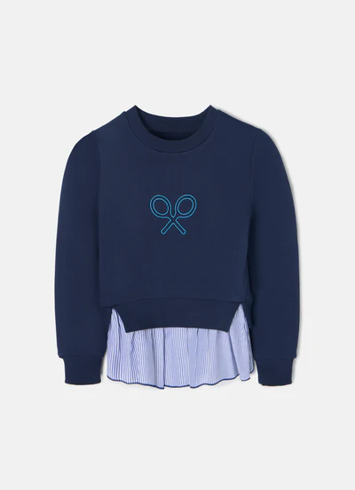 Sudadera girl color azul marino confeccionada en mezcla de algodón. Presenta detalle de volante camisero a rayas en la parte inferior y raquetas bordadas a contraste en celeste en el torso. Cuenta con cuello redondo y manga recta con puño elástico. Fabricada en Portugal.