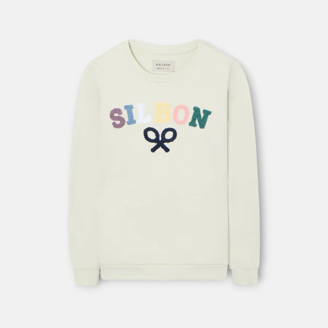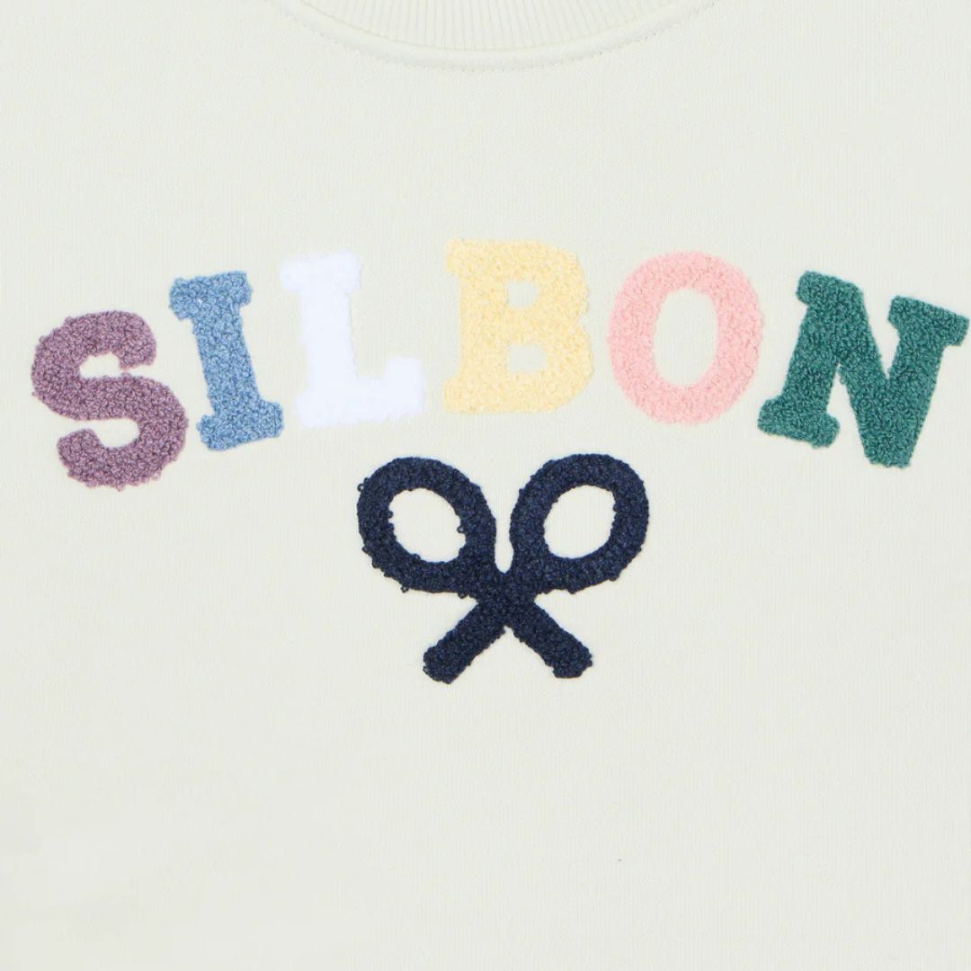 Logotipo Icónico: Presenta el nombre de la marca «SILBON» en un llamativo diseño multicolor con textura de rizo (chenilla), acompañado de las emblemáticas raquetas cruzadas bordadas en la parte central.