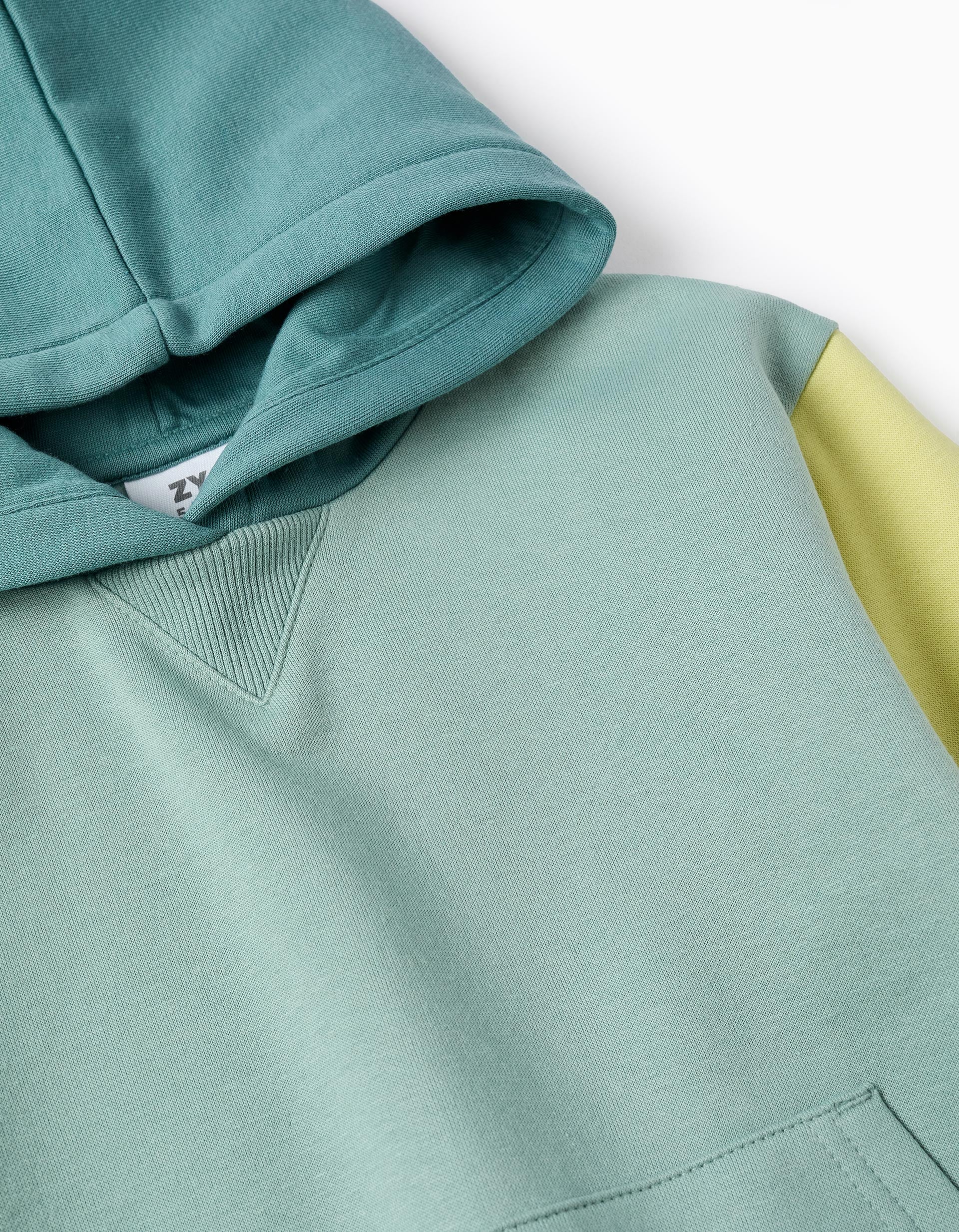 Sudadera multicolor con capucha de Zippy, con torso verde agua, mangas amarillas y dobladillo gris.