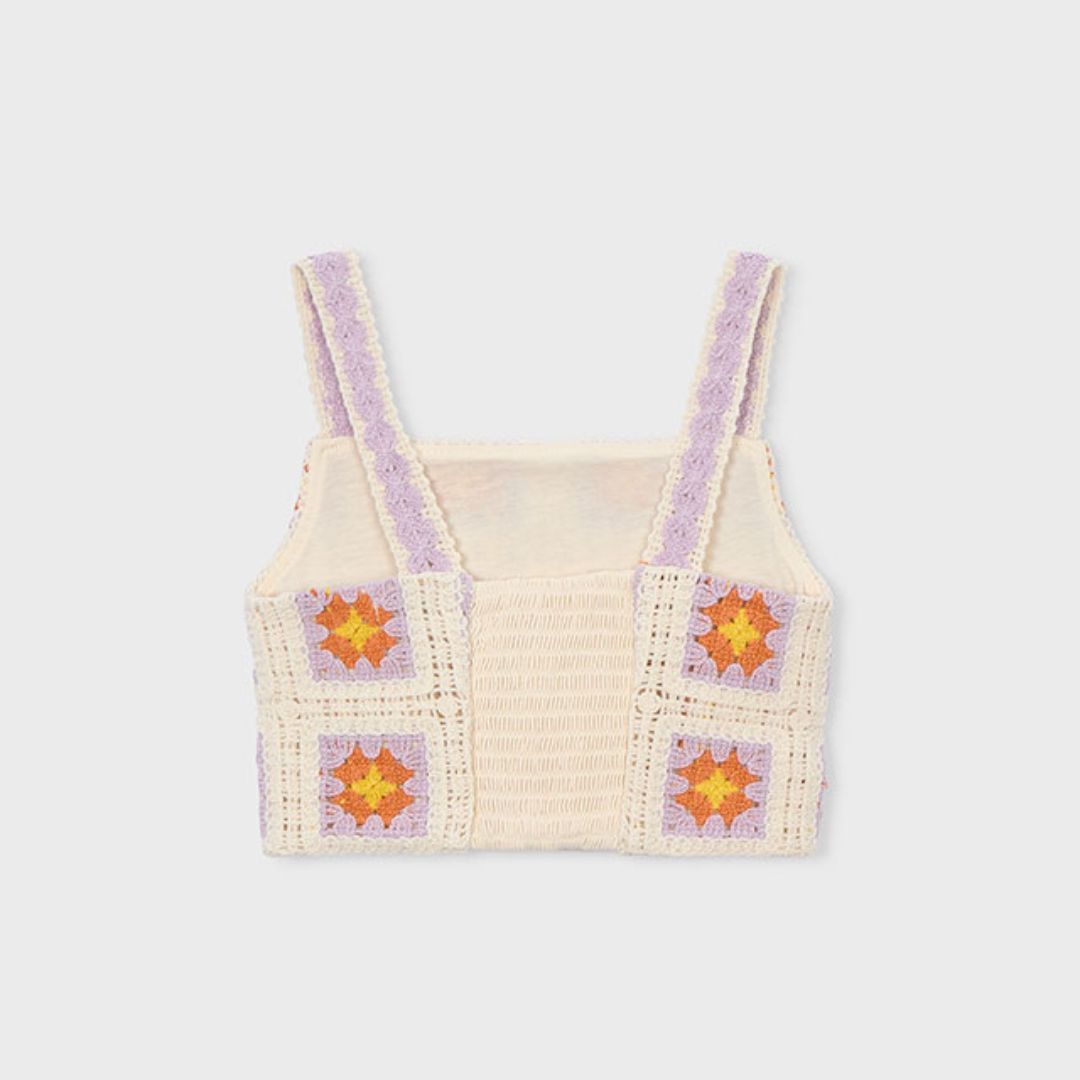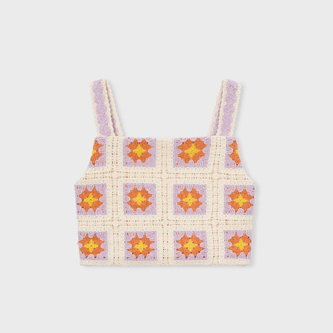 Súmate a la tendencia más colorida del verano con este top de crochet. Inspirado en el estilo clásico de los «cuadros de la abuela», esta prenda combina la artesanía tradicional con un diseño moderno y juvenil, perfecto para crear looks frescos y llenos de personalidad.