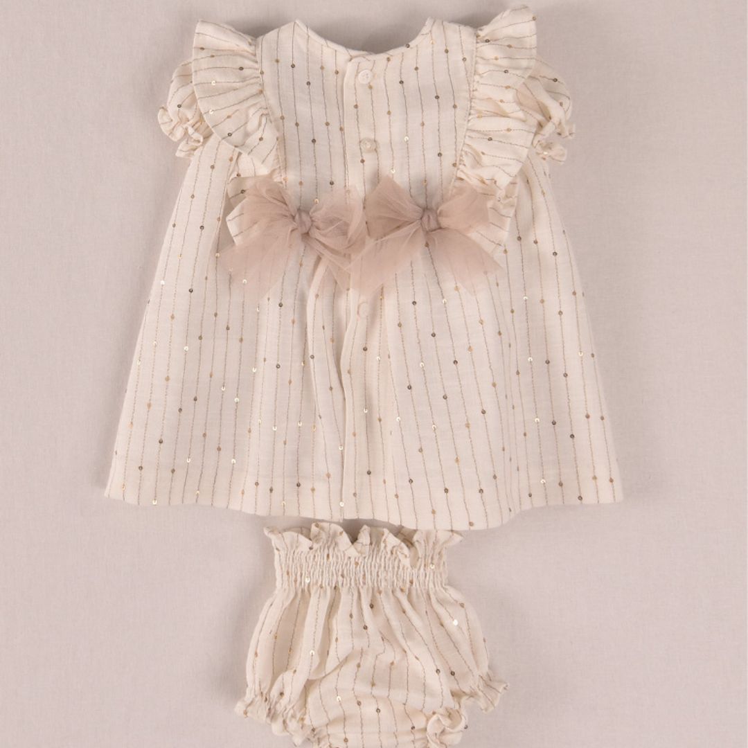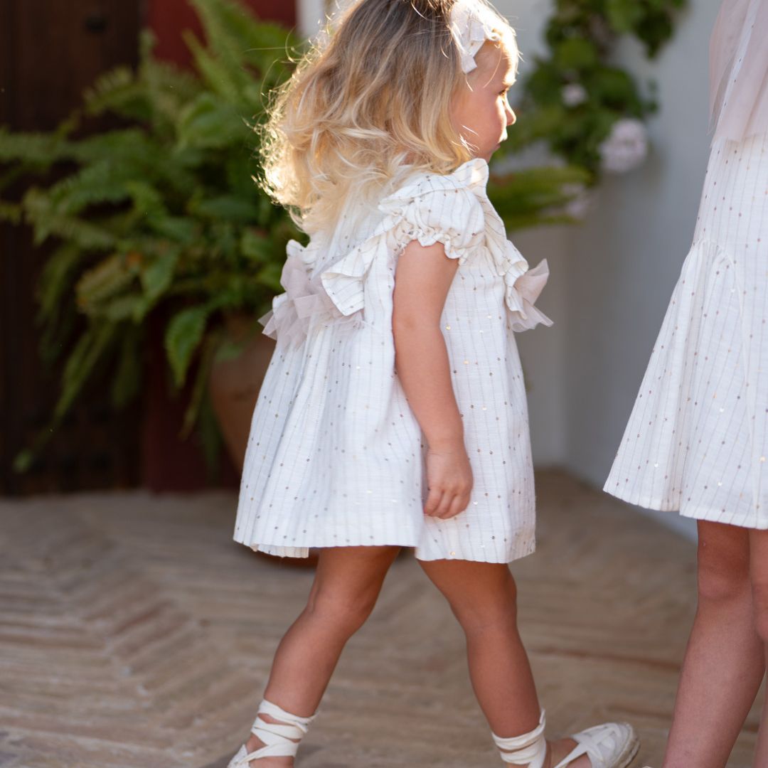 Ilumina las ocasiones más especiales con el Vestido Familia Dorado de José Varón. Este conjunto de dos piezas destaca por su diseño sofisticado, donde los detalles metalizados y los acabados románticos crean un look de ceremonia inolvidable para las niñas de la casa.