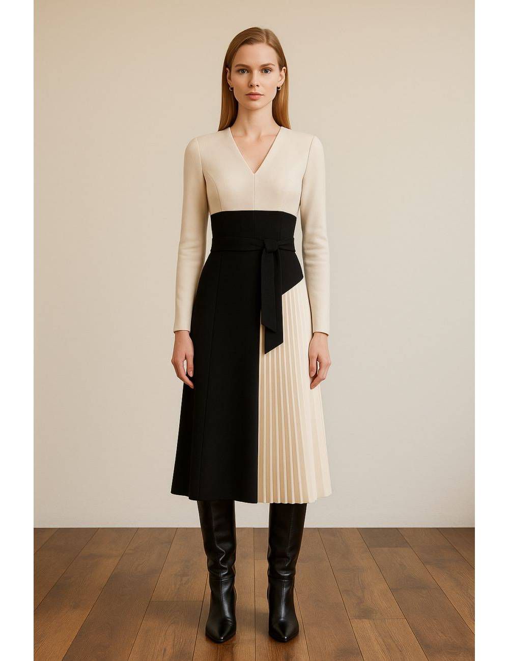 Vestido midi elegante en tono crema y negro con diseño de cintura alta y lazo decorativo. Corte en línea A con falda plisada asimétrica que aporta movimiento y sofisticación . Confeccionado en tejido estructurado, ideal para ocasiones formales o de oficina. Combina la perfección con botas altas o tacones.