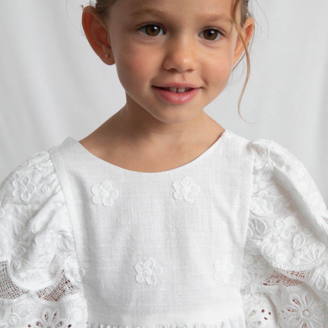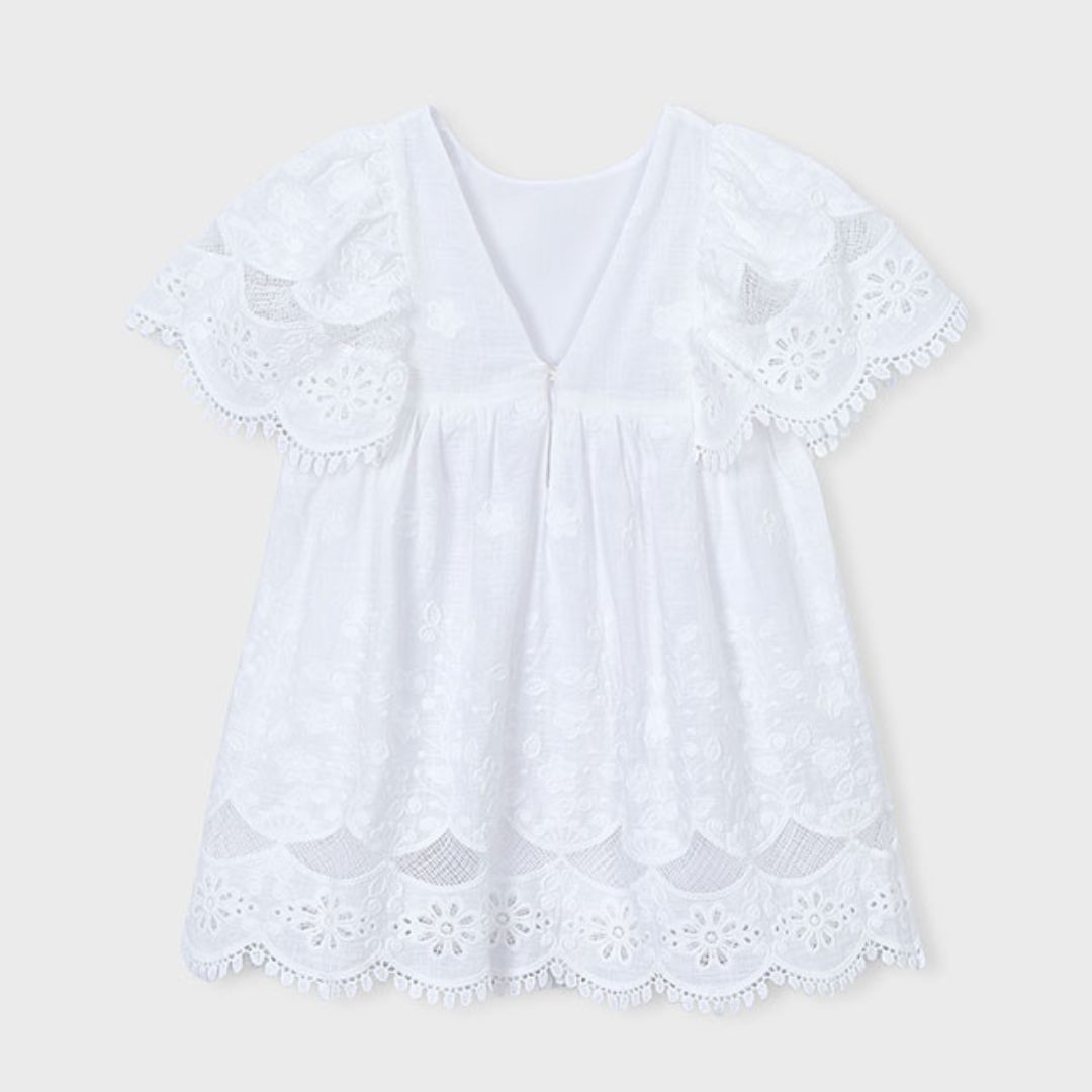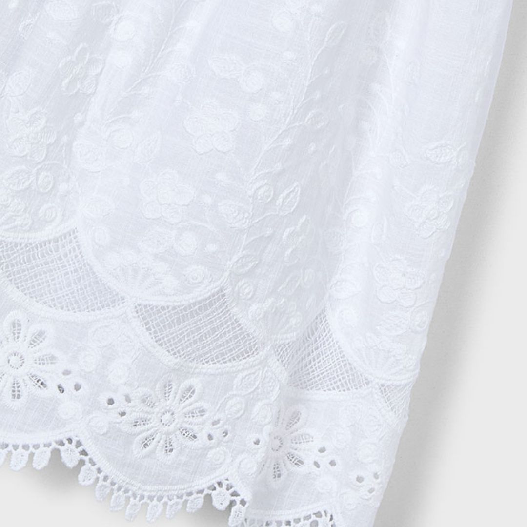 Haz que brille en su próximo evento con este espectacular vestido de ceremonia de la marca Mayoral. Confeccionado íntegramente en un exquisito tejido de algodón con bordado suizo, esta prenda combina la elegancia clásica con un aire etéreo y romántico, ideal para bautizos, bodas o comuniones.