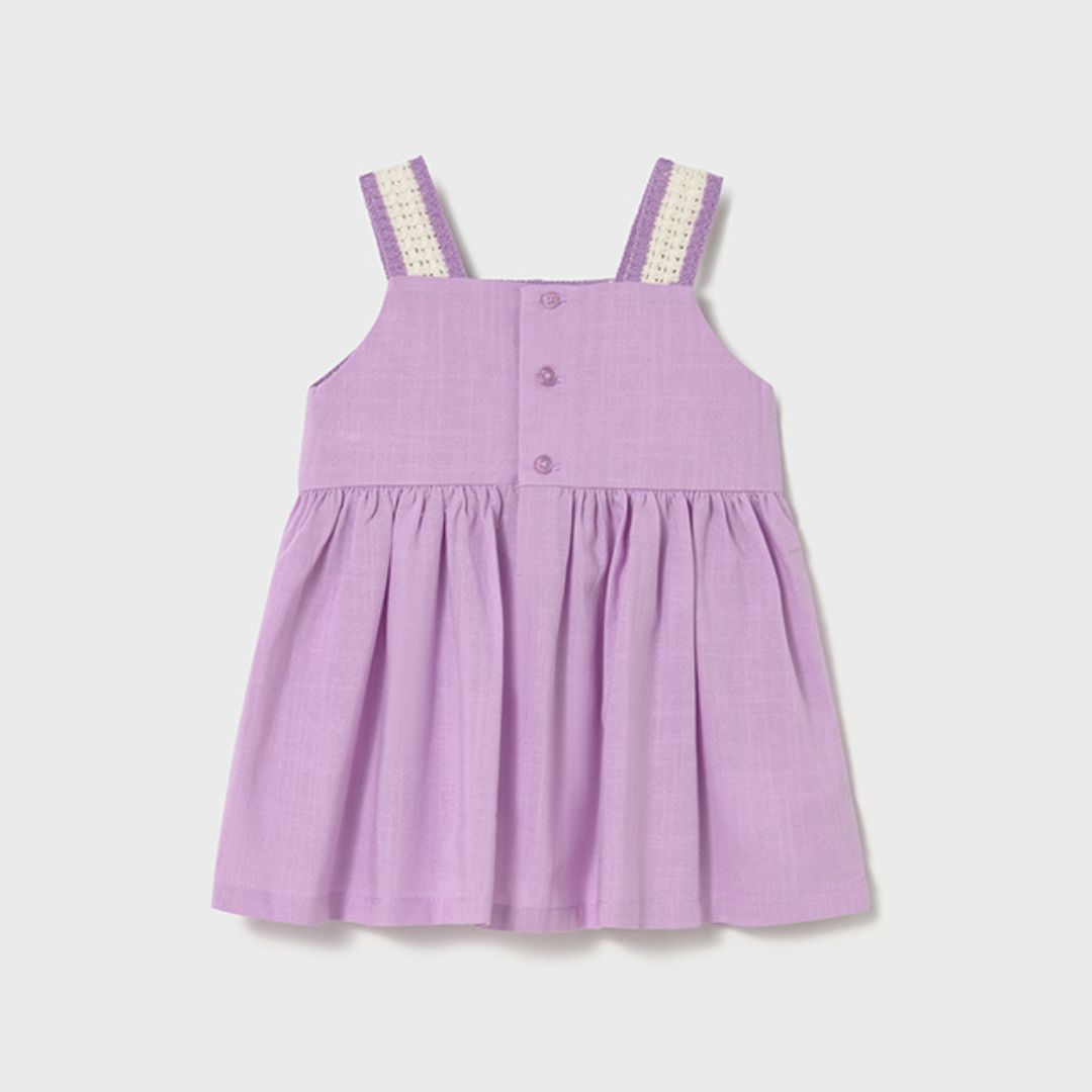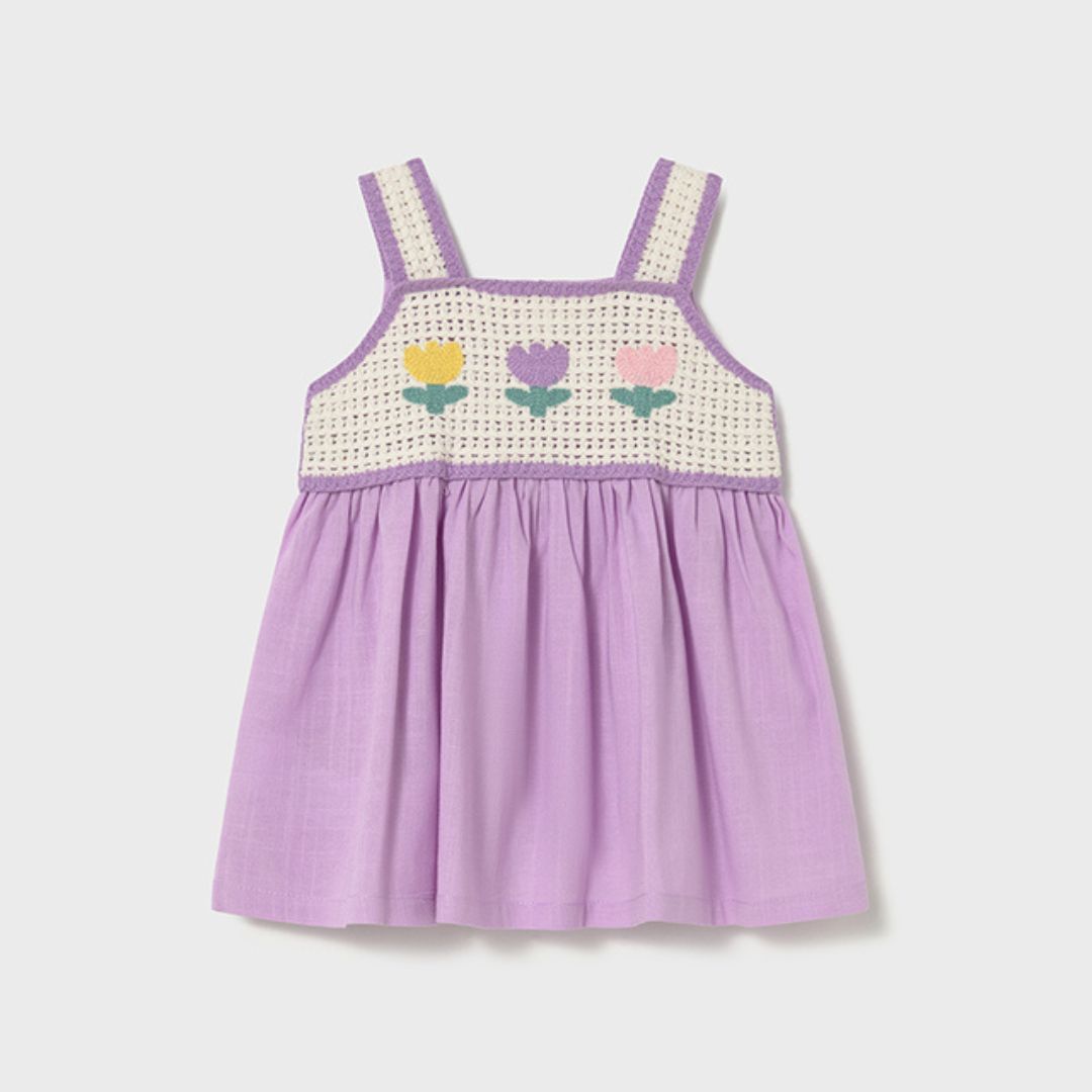 Añade un toque artesanal y dulce al armario de tu pequeña con este precioso vestido de Mayoral. Este diseño destaca por su original combinación de texturas, uniendo el encanto del punto crochet con la ligereza de una falda de vuelo, ideal para ocasiones especiales o paseos bajo el sol.