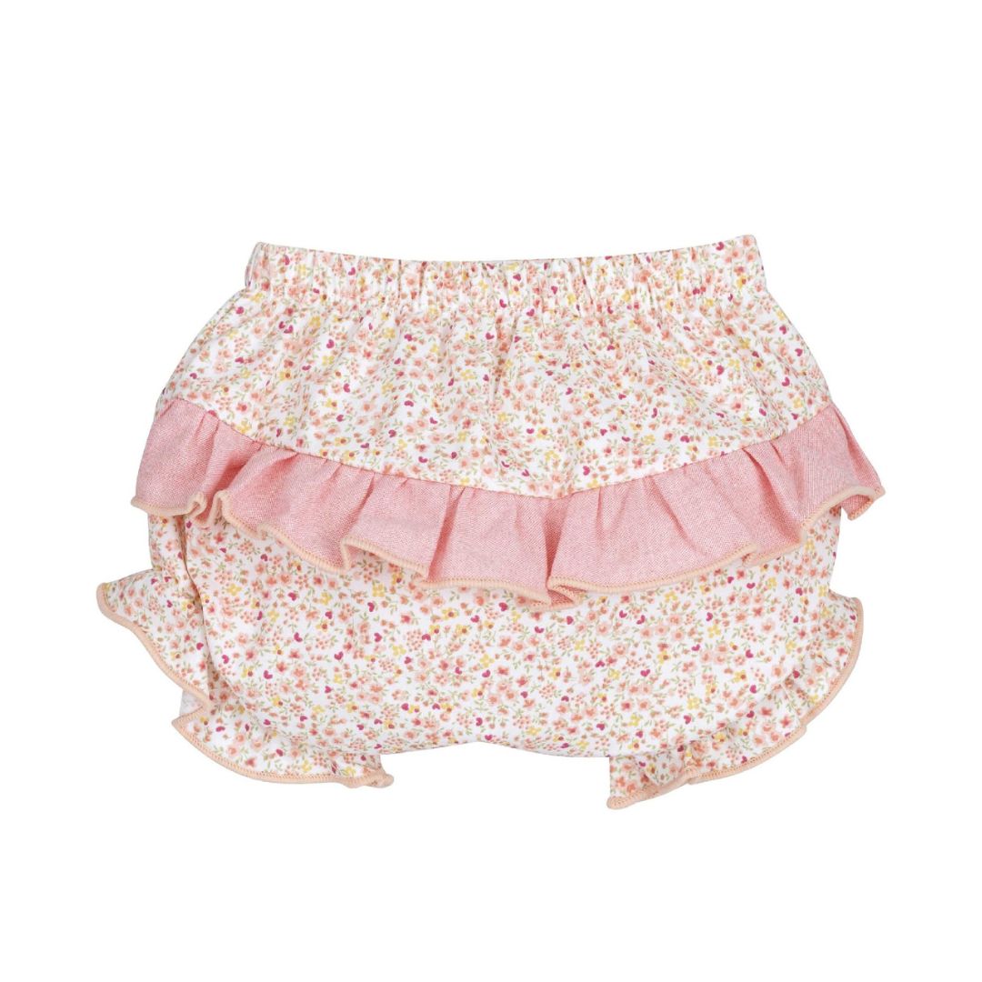 Braguita a Juego: Incluye una braguita (cubrepañal) coordinada con el mismo estampado floral, adornada con un volante trasero en rosa coral que completa el look con total armonía.