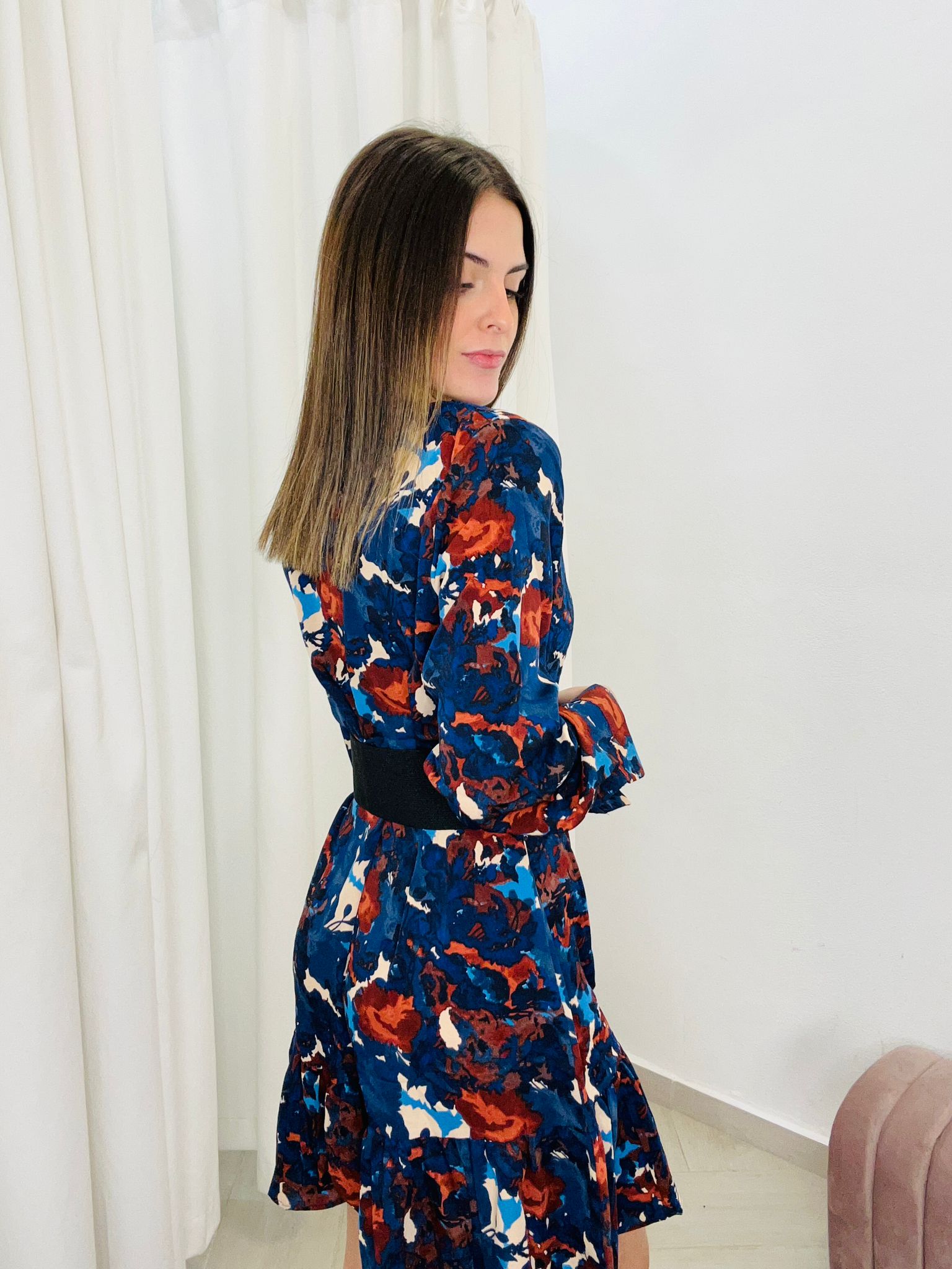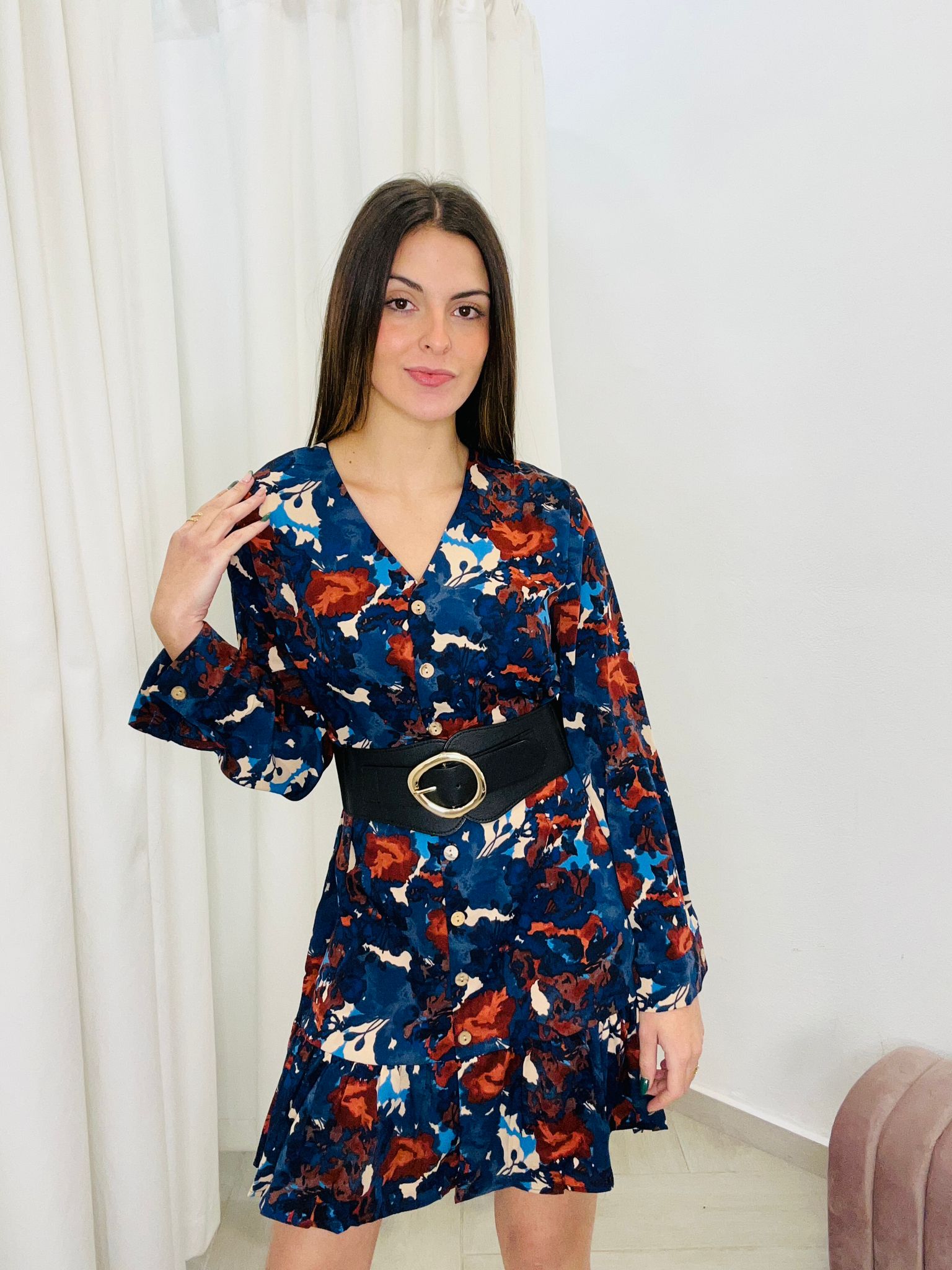Luce un look femenino con este vestido camisero corto, diseñado en un estampado en tonos azules y caldera que aporta personalidad y estilo.