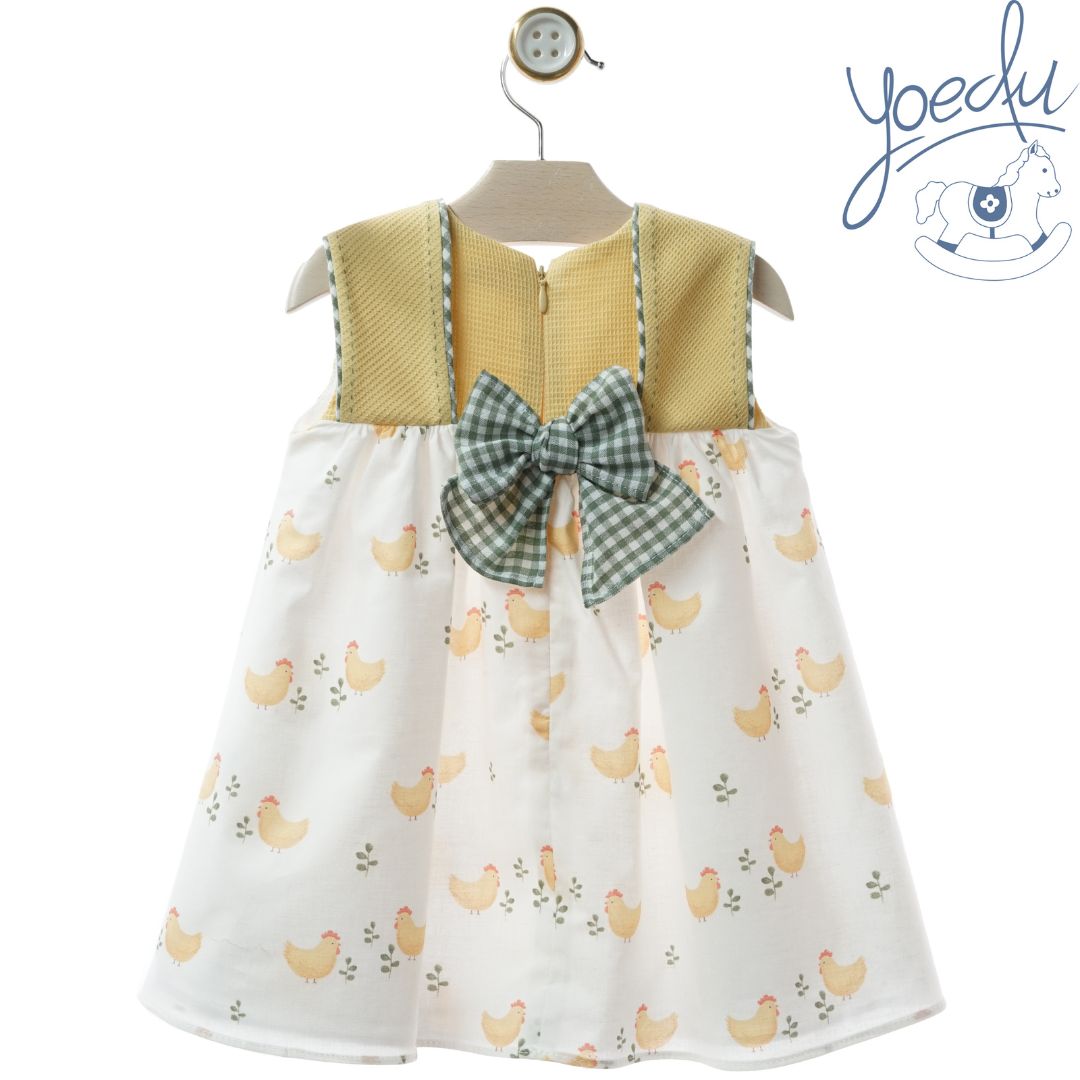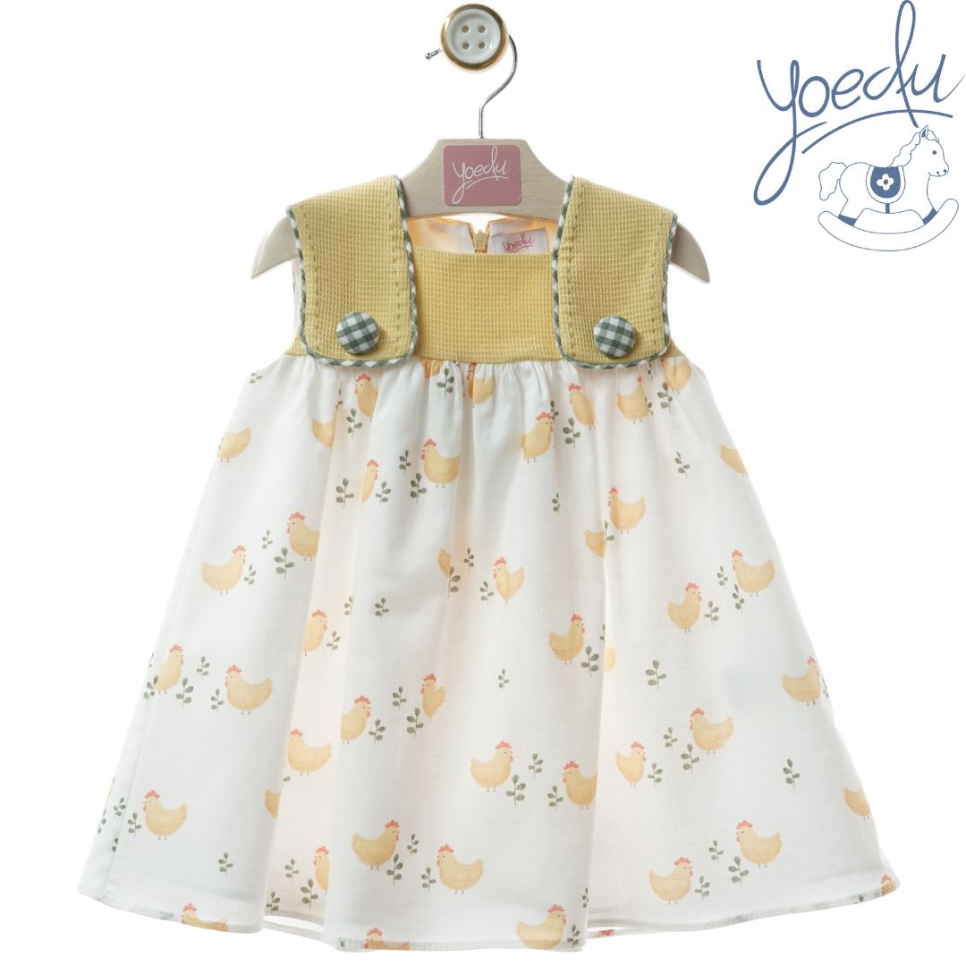 Estampado Exclusivo: La falda de vuelo está confeccionada en una tela blanca de alta calidad, decorada con un encantador motivo de pollitos amarillos, creando un look infantil clásico pero renovado.