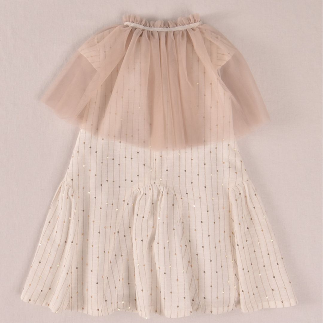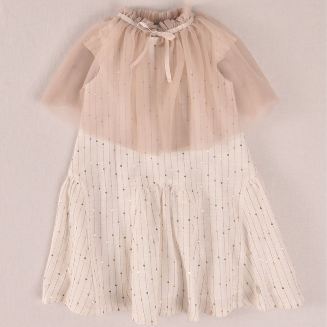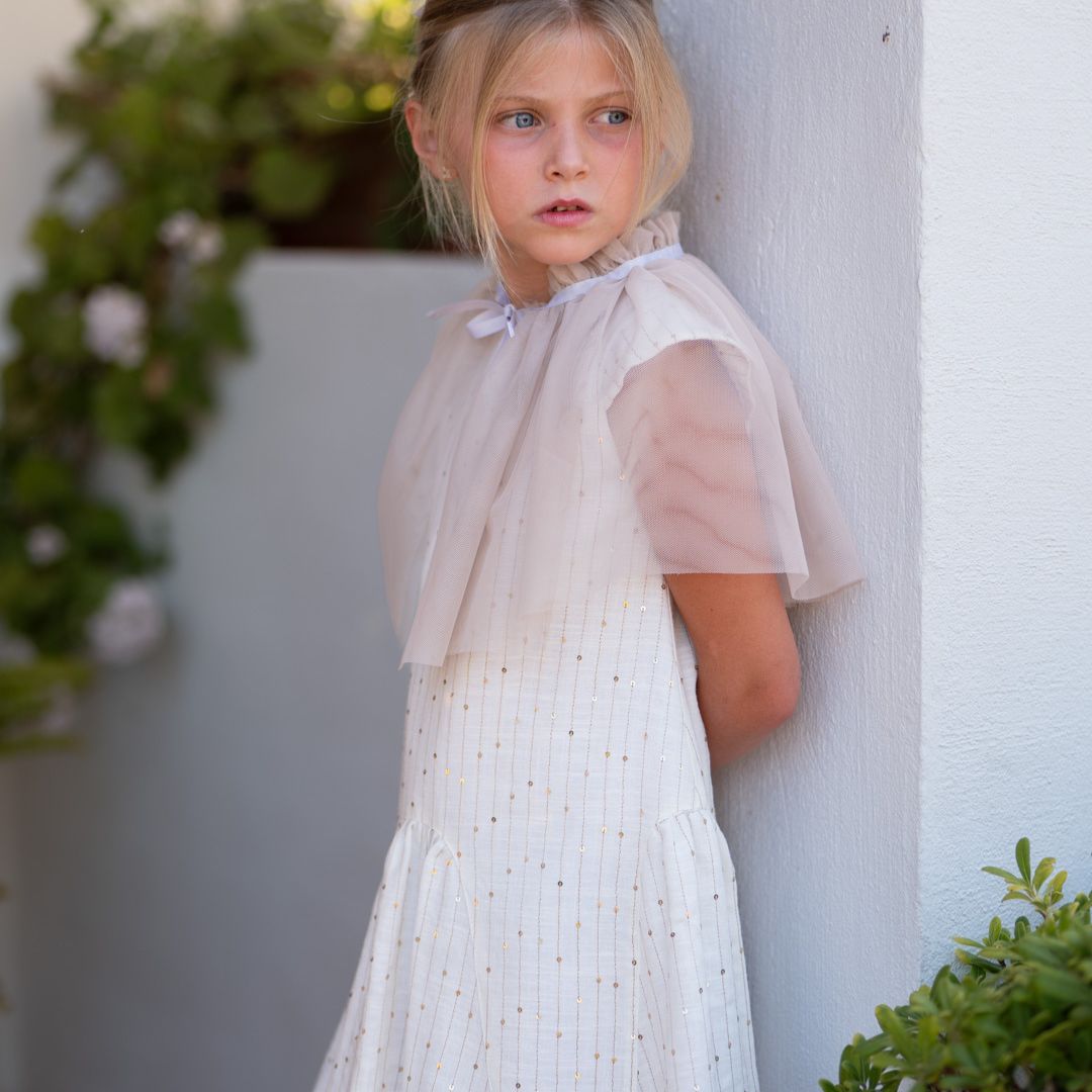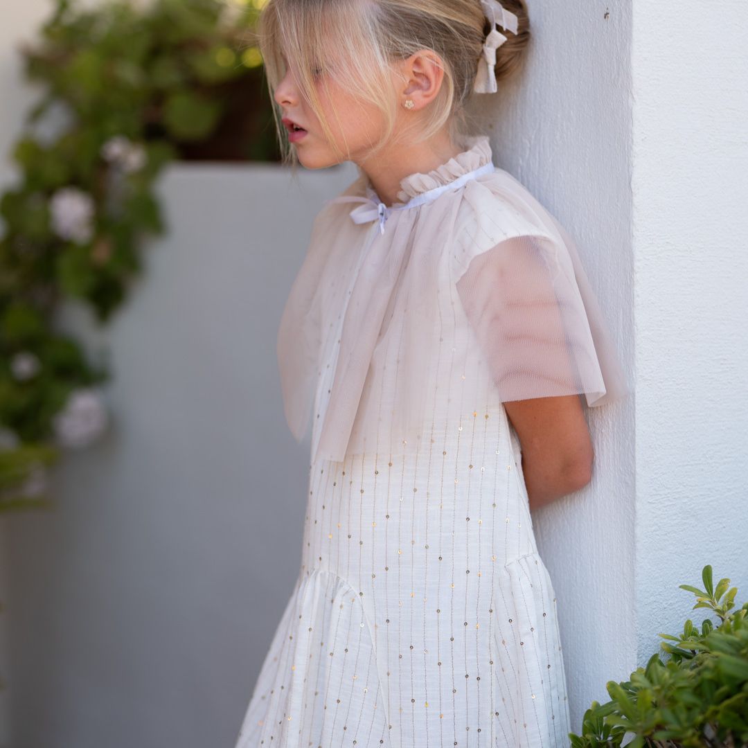 Este vestido es la opción ideal para las niñas que asisten a comuniones, bodas o cenas de gala. Su diseño equilibra perfectamente la tradición de la moda infantil española con tendencias contemporáneas de lujo.