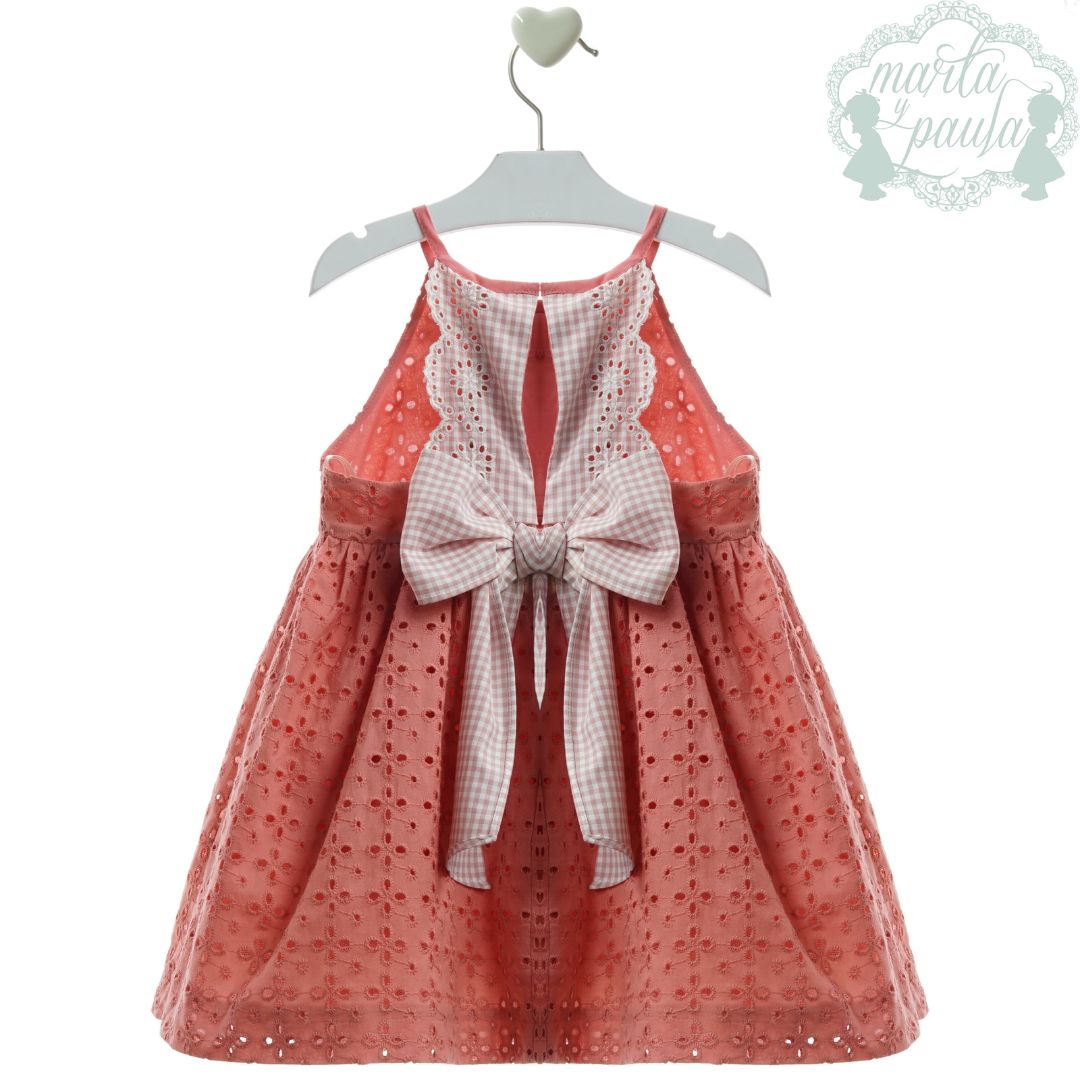 Escote en Pico y Gran Lazada: El verdadero protagonista de este diseño es su espalda, que presenta un elegante escote en pico rematado con una gran lazada de cuadros vichy en rosa y blanco, creando un efecto visual espectacular y de alta costura.
