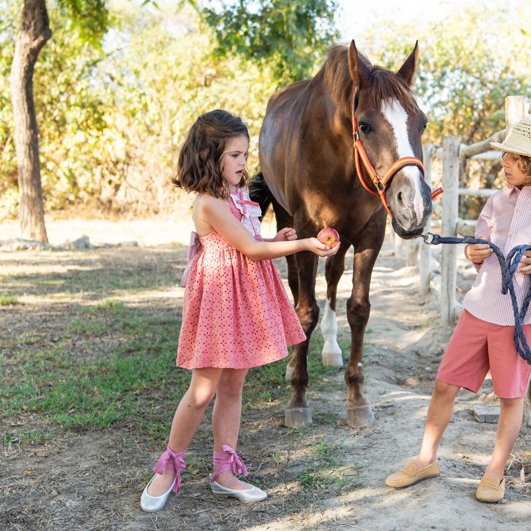 Eleva el estilo de las más pequeñas con el vestido infantil de la Familia Maemuki, una pieza magistral de la firma Marta y Paula. Este vestido destaca por su vibrante color teja y una combinación de texturas que destila sofisticación y frescura en cada detalle.