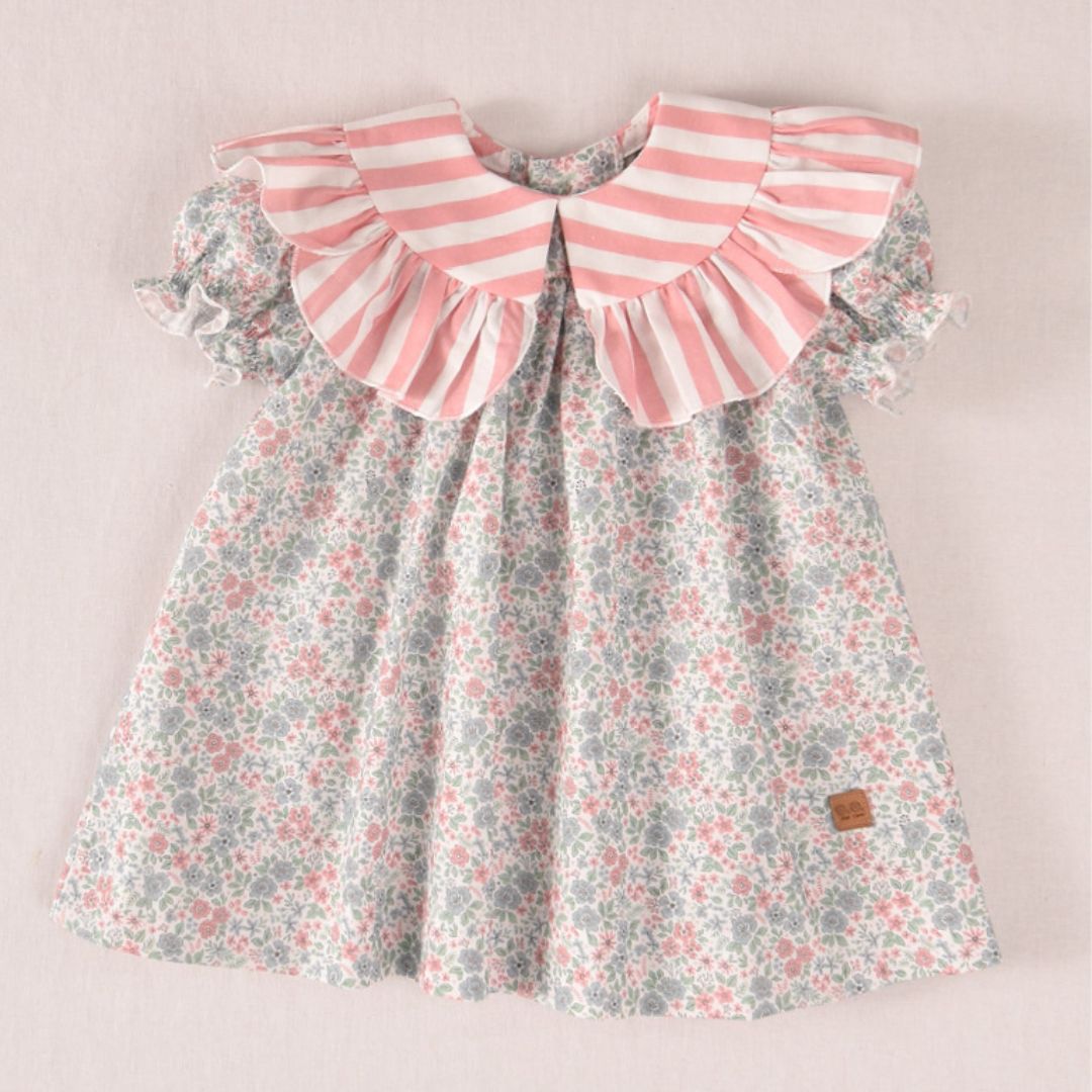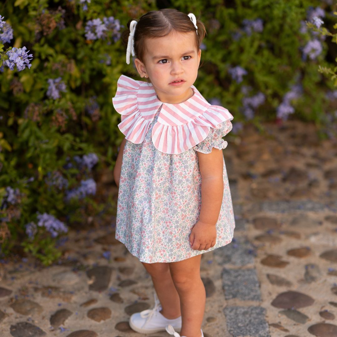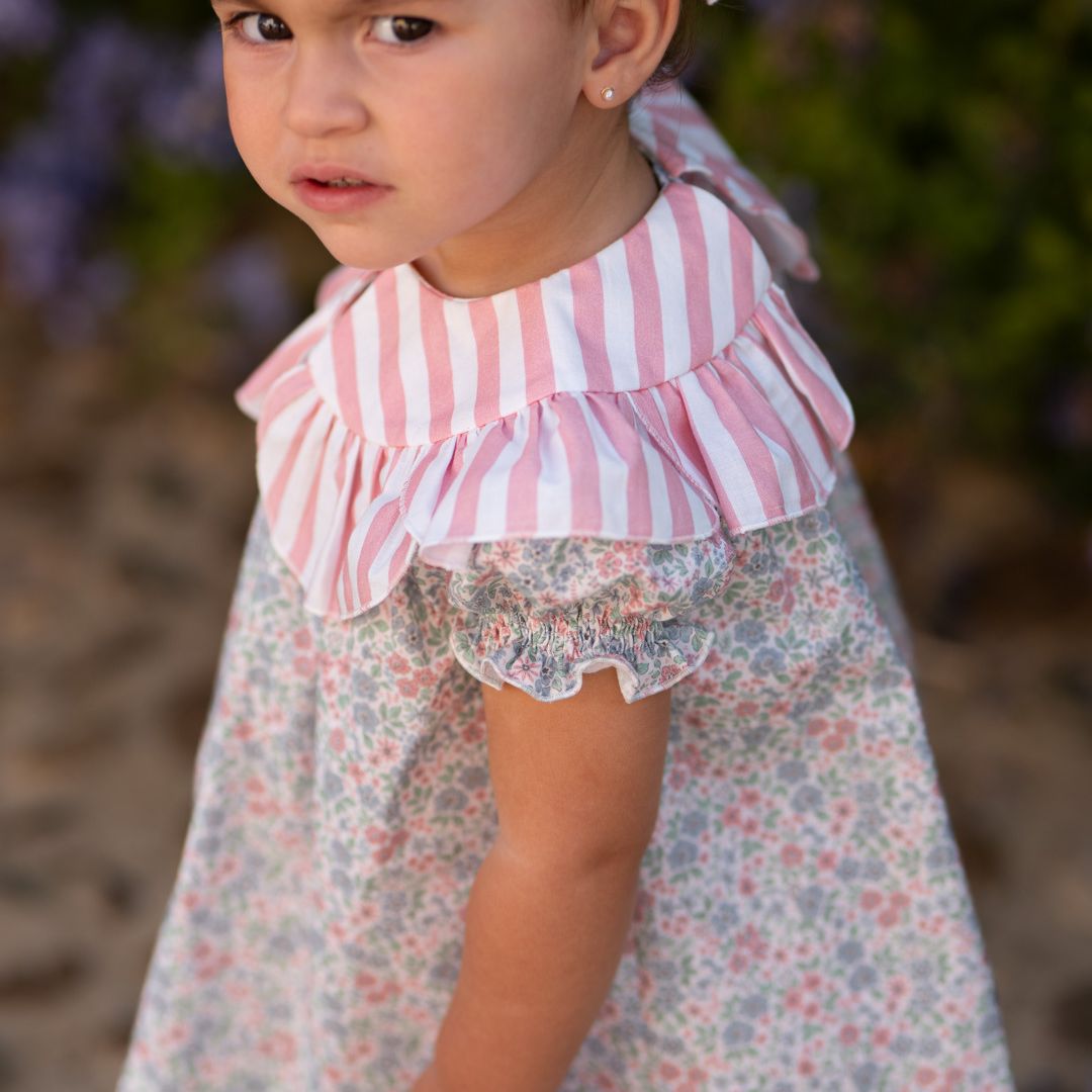Eleva el armario de tu pequeña con esta pieza única de la Colección Casual de José Varón. Este vestido es la máxima expresión del estilo romántico y dulce, fusionando con maestría dos de los estampados más icónicos de la moda infantil: las flores Liberty y las rayas clásicas.