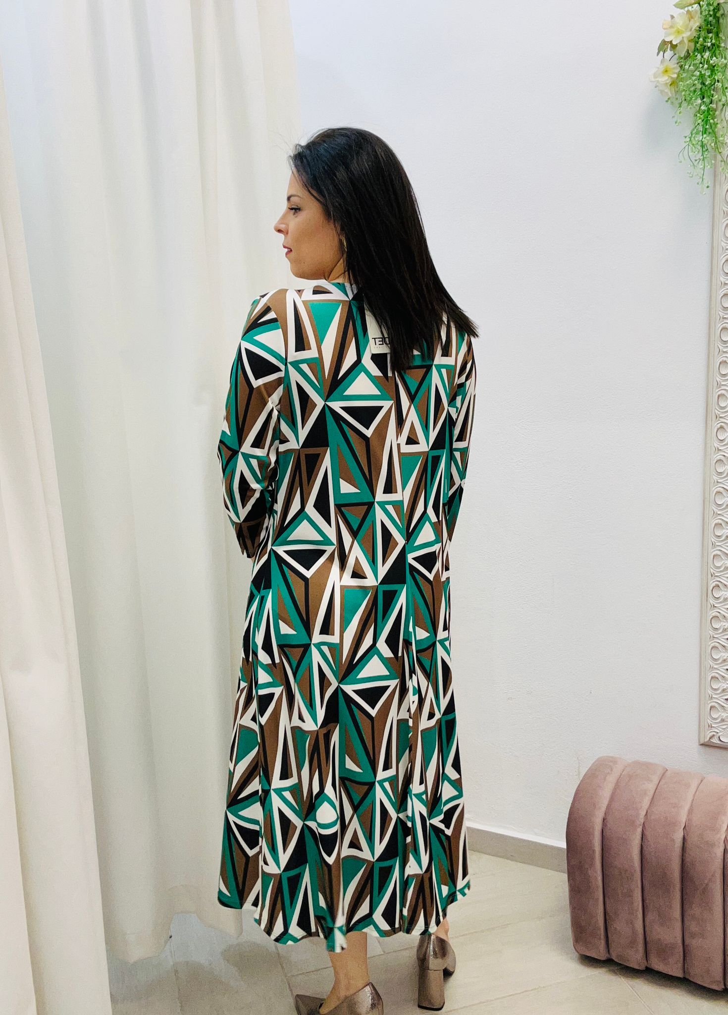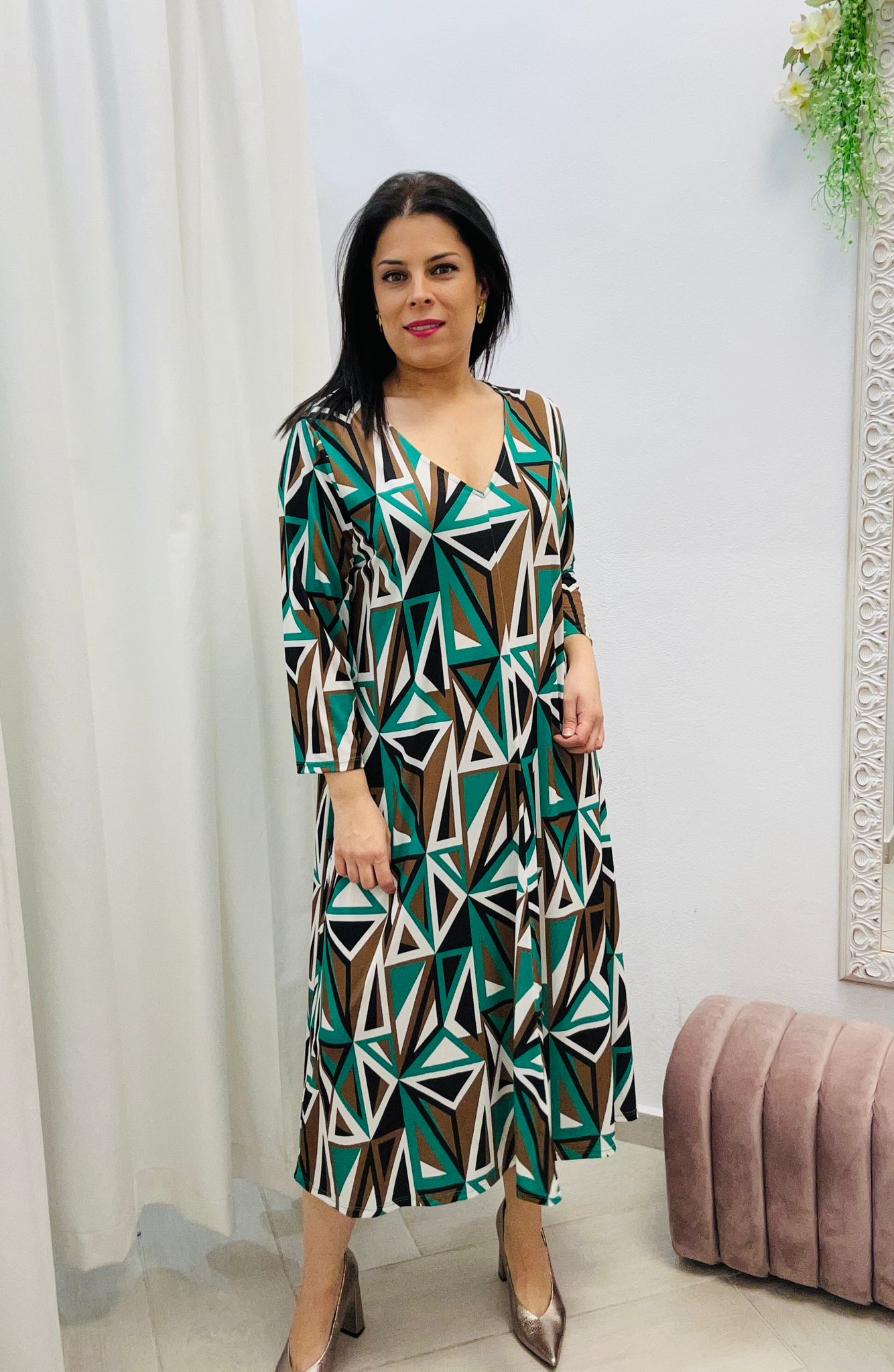 Dale un toque moderno y elegante a tu estilo con este vestido midi de estampado geométrico. Su diseño en tonos verde, marrón, blanco y negro crea un efecto visual único que estiliza la figura y añade personalidad a cualquier look.