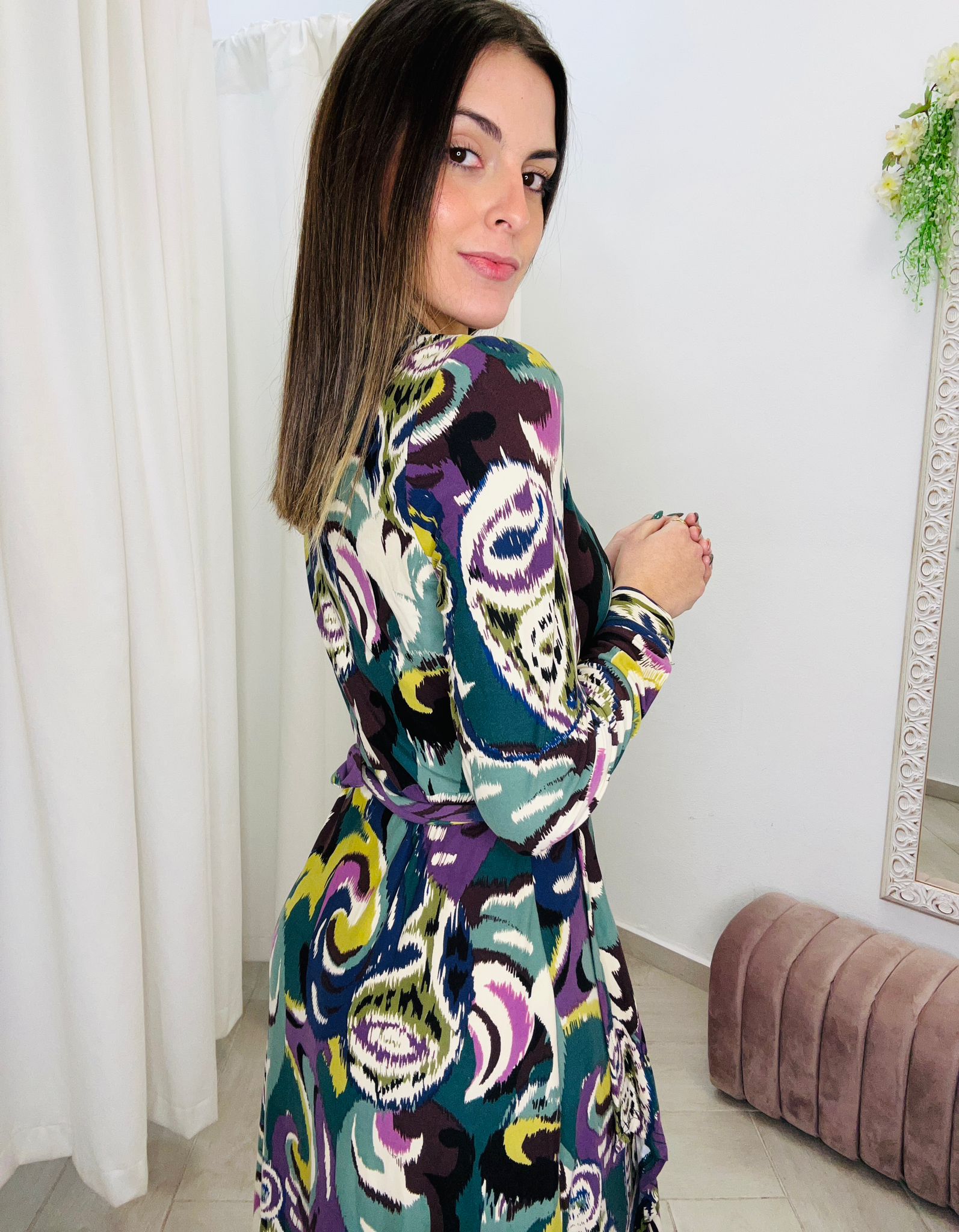 Su cuello en pico estiliza la figura y el cinturón permite marcar la cintura, ofreciendo un ajuste favorecedor.